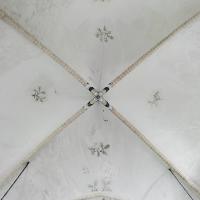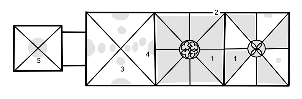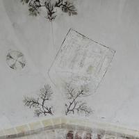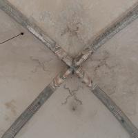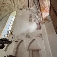 nl In de beide oostelijke traveeën architectuurpolychromie uit ca. 1300: baksteenimitatie met witte voegen op wanden, witgepleisterde gewelven sommige velden onbeschilderd, andere voorzien van rijk gevarieerde vlechtwerkpatronen en op ribben geometrische motieven -de in het pleisterwerk getrokken lijnen nog zichtbaar - hoofdzakelijk in grijs en rood, enkele gestileerde bloemmotieven Op noordwand tweede travee uit het oosten band met ranken. Westelijk gewelf: velden wit, ribben rood met witte voegen, ca 1400. Op gewelf toren eenvoudige decoratie uit begin 15de eeuw. (bron:Q122982902)
