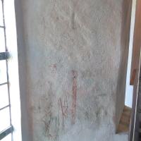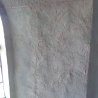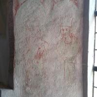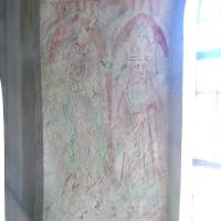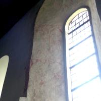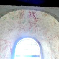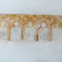 nl Van begin af aan wit gepleisterd. Op noordwand: fries van driepasnissen, afgesloten door lijst in blokverband, 2de helft 14de eeuw, alsmede restanten van figuren in nissen, wijdingskruis. Ca. 1400 beschildering dagkanten middelste koorvenster: bovenin Maiestas Domini; op dagkanten: boven elkaar twee arcades van telkens twee driepasnissen, gescheiden door decoratieve rand, in elke nis vrouwelijke heilige - die aan de noordzijde waarschijnlijk Barbara-, op links aansluitend muurvlak fragment van palmettenrand rondom de vensteropening. (bron:Q122982902)