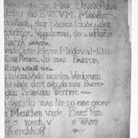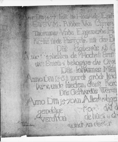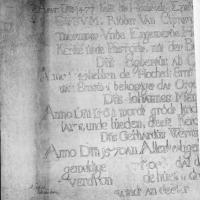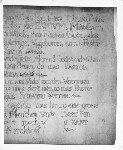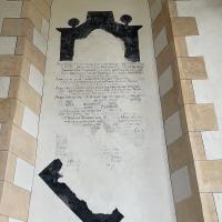 13 commemoratieve opschriften tegen achtergrond van twee monochroom geschilderde rouwborden