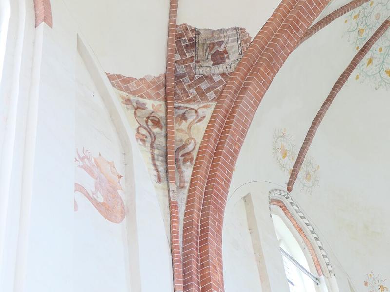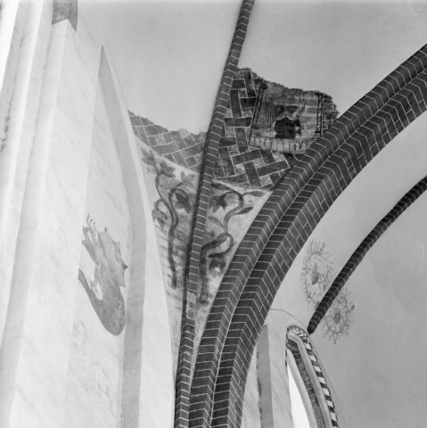 Objectenmet "muurschildering id:6a restanten evangelistensymbolen in architectonische omlijsting, herkenbaar engel (Mattheüs)"