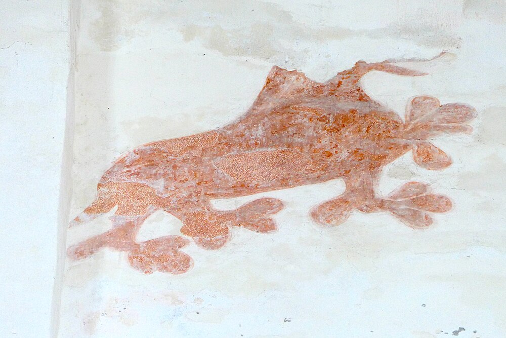 Objectenmet "muurschildering id:8 panter, mogelijk bedoeld als symbool van het goede tegenover het kwaad in nr. 7."