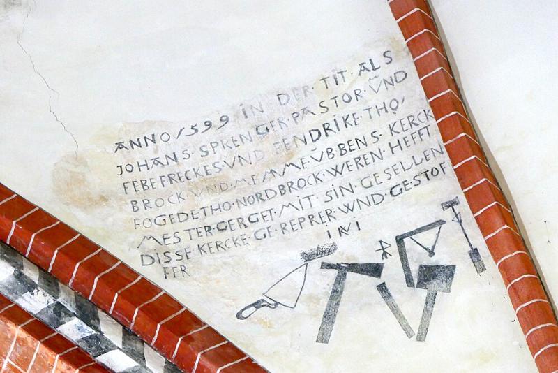 16 tekst ANNO 1599 IN DER TIT ALS/ JOHANS SPRENGER PASTOR VND/ FEBE FRECKES VND FENDRIKE THO BROCK UND MEMME VBBENS KERC/FOGEDE THO NORDBROCK WEREN HEFFT/MESTER GERGET MIT SIN GESELLEN / DISSE KERCKE GEREPRER. WND GESTOF/FER; hieronder twee huismerken en metselaarsgereedschap: troffel, dissel, beitel, winkelhaak, passer, hamer, schietlood; 1599 herstel vieringgewelf