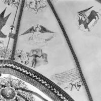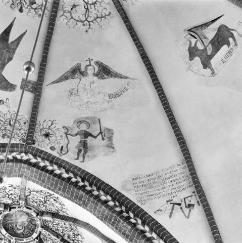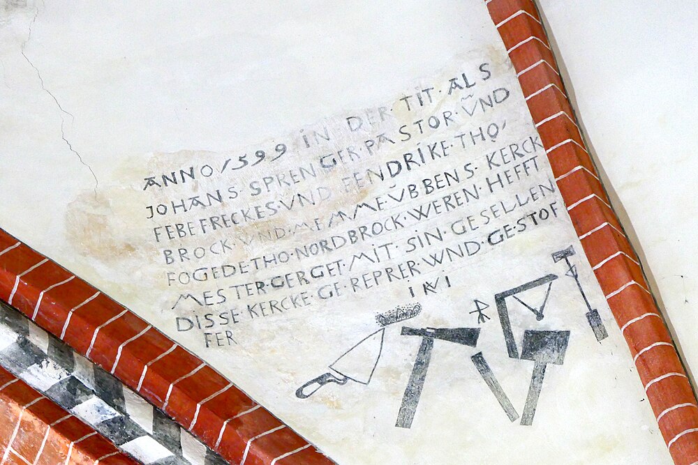 Objectenmet "muurschildering id:16 tekst ANNO 1599 IN DER TIT ALS/ JOHANS SPRENGER PASTOR VND/ FEBE FRECKES VND FENDRIKE THO BROCK UND MEMME VBBENS KERC/FOGEDE THO NORDBROCK WEREN HEFFT/MESTER GERGET MIT SIN GESELLEN / DISSE KERCKE GEREPRER. WND GESTOF/FER; hieronder twee huismerken en metselaarsgereedschap: troffel, dissel, beitel, winkelhaak, passer, hamer, schietlood."