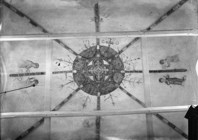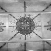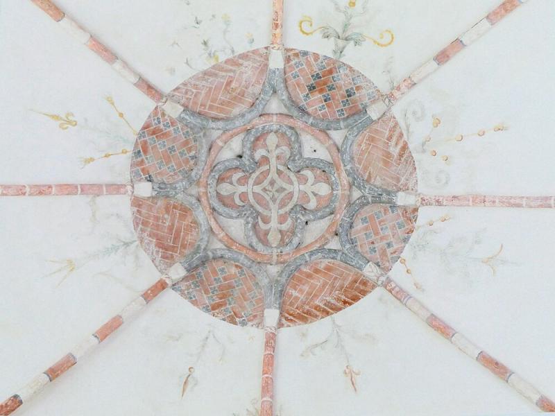 1 o.a. Lelies en kruis in sluitring, lager in velden drie-, vier-, vijf- en zespassen (in pleisterwerk getrokken lijnen nog zichtbaar) tegen een achtergrond van baksteen-imitatie