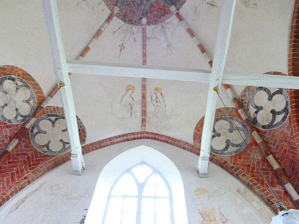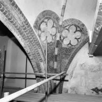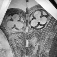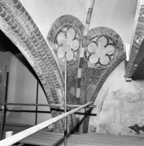 Objectenmet "muurschildering id:1a Drie-, vier-, vijf- en zespassen (in pleisterwerk getrokken lijnen nog zichtbaar) tegen een achtergrond van baksteen-imitatie"