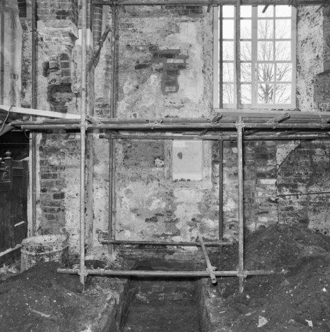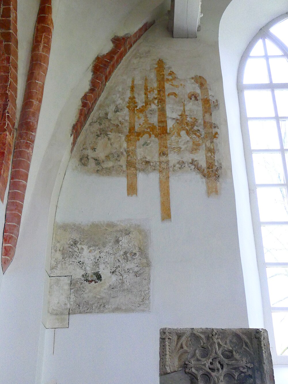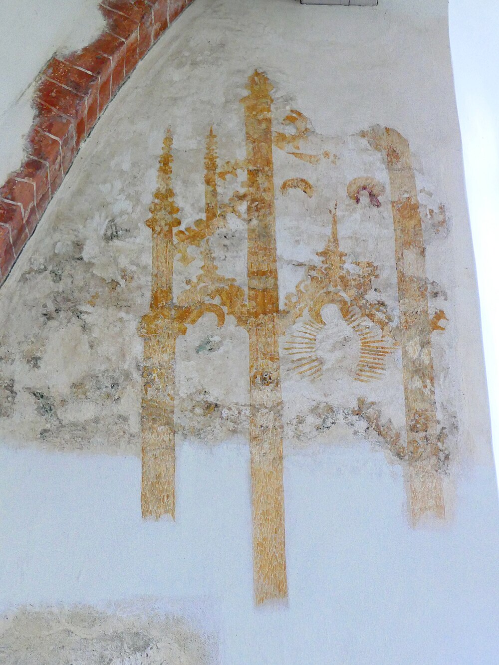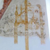 Objectenmet "muurschildering id:9 Gotische architectuur met restanten van heiligen, de middelste waarschijnlijk Maria"