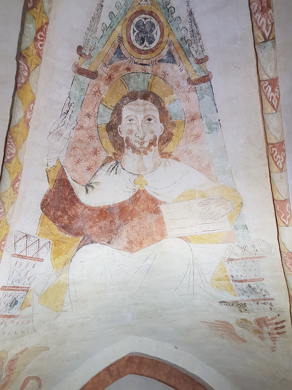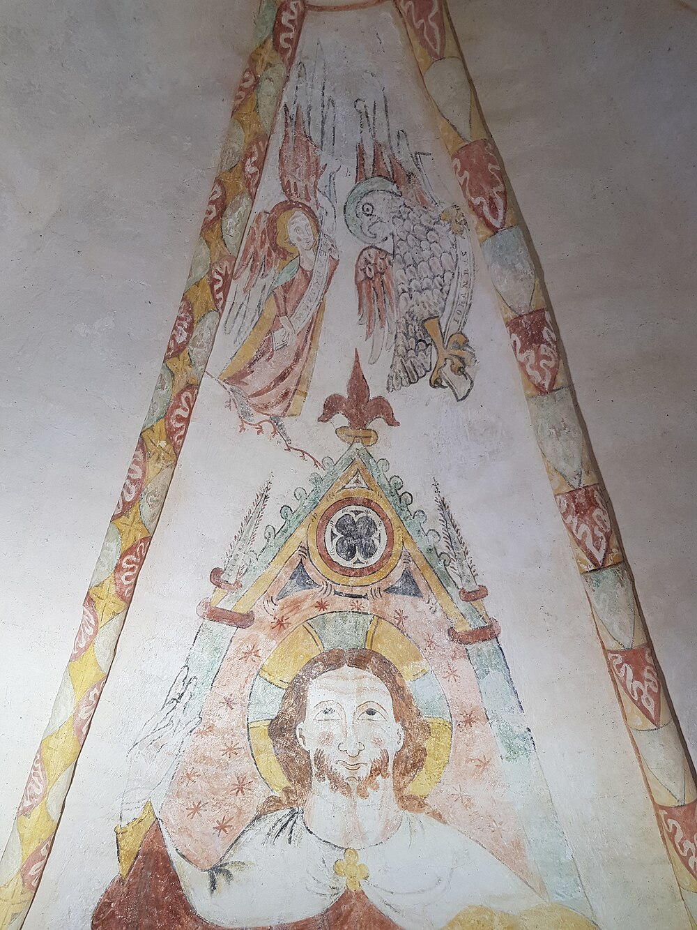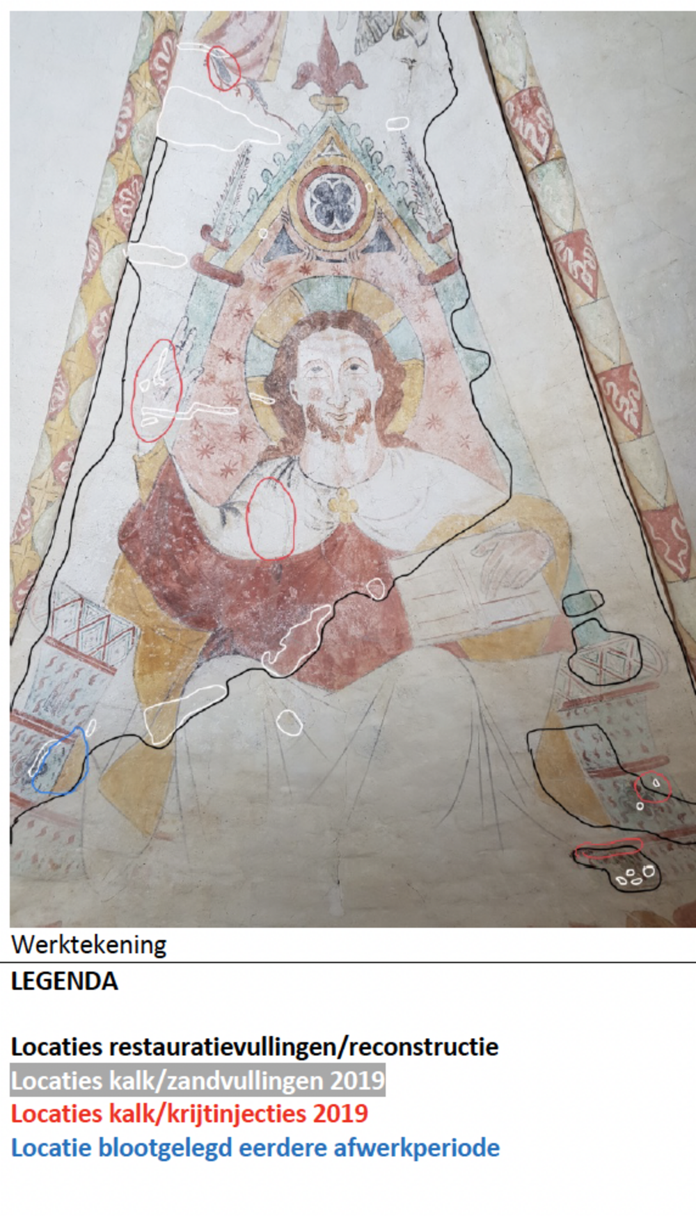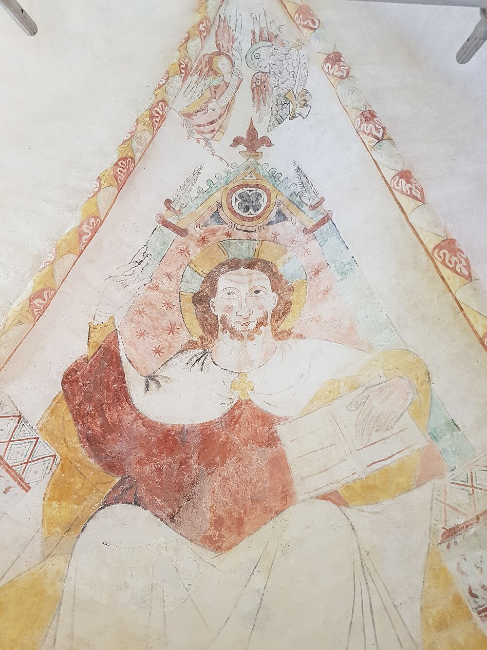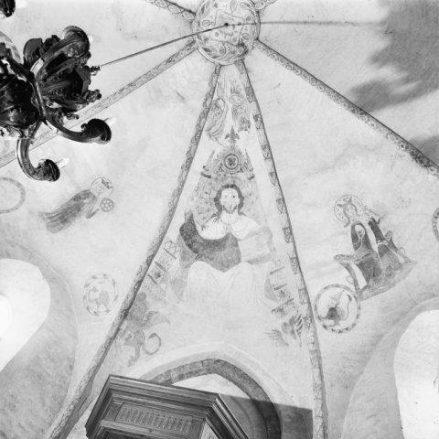 3 Maiestas Domini; de namen van de vier evangelisten slechts fragmentarisch bewaard gebleven; Bij restauratie 1949-1950 vooral Maiestas Domini sterk aangevuld.