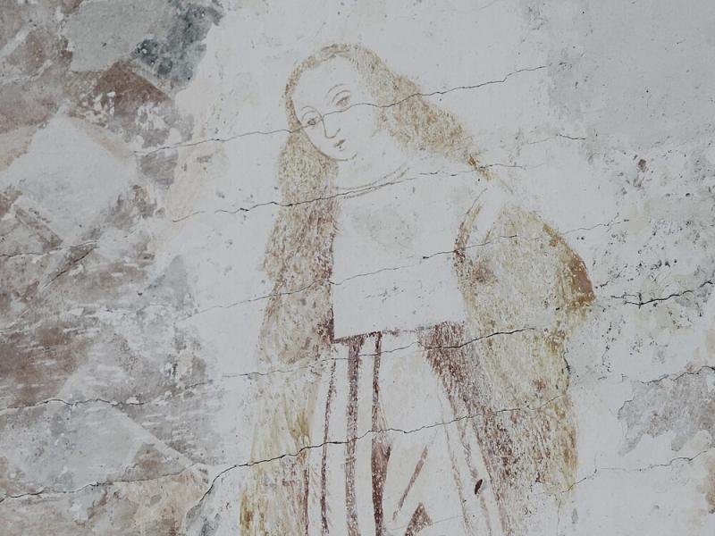 Objectenmet "muurschildering id:1c Evangelistensymbolen, vrouwelijke heilige, Antonius Abt (fragment), Stephanus"