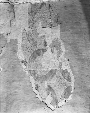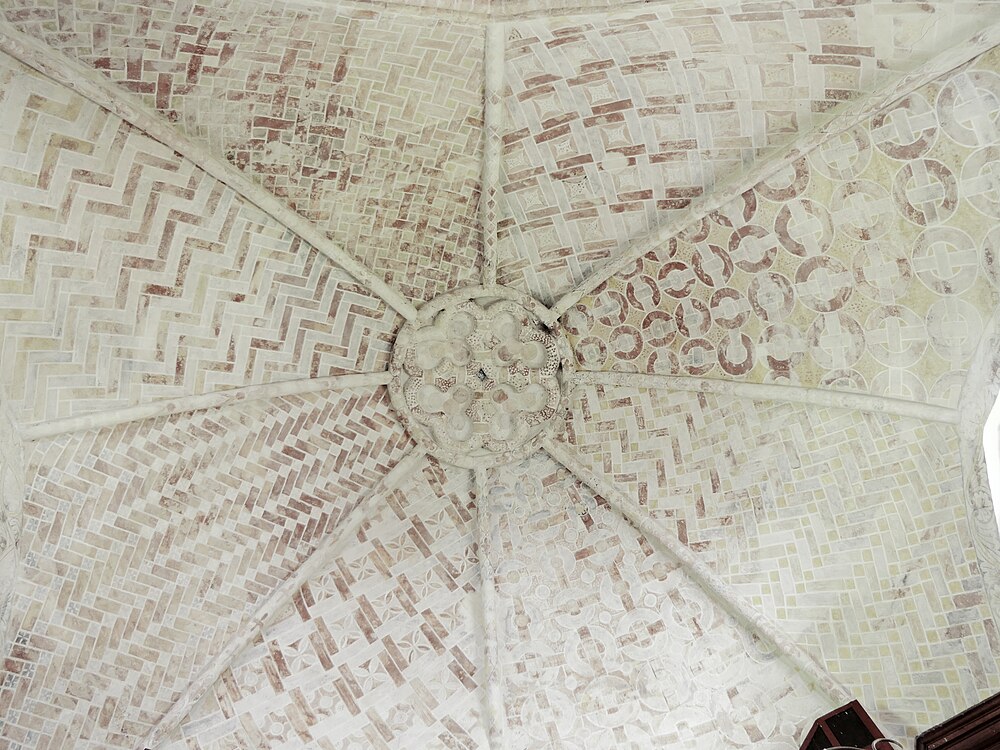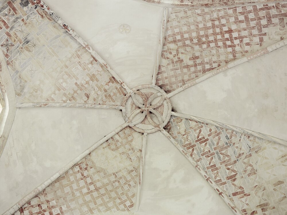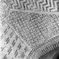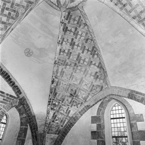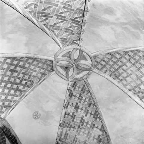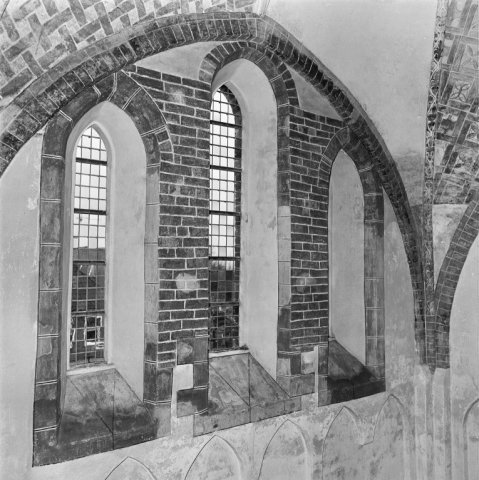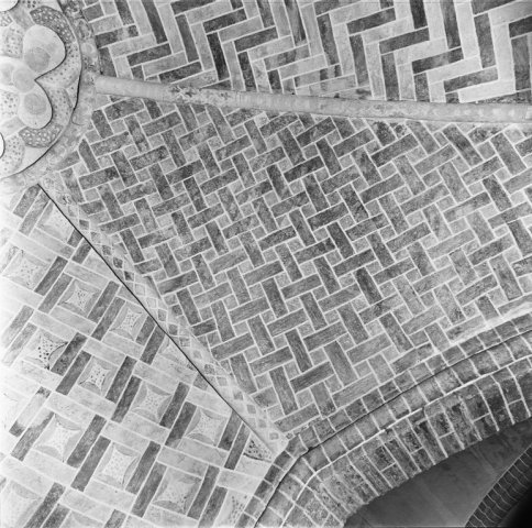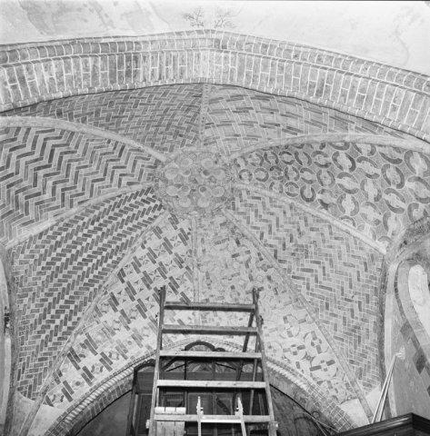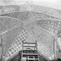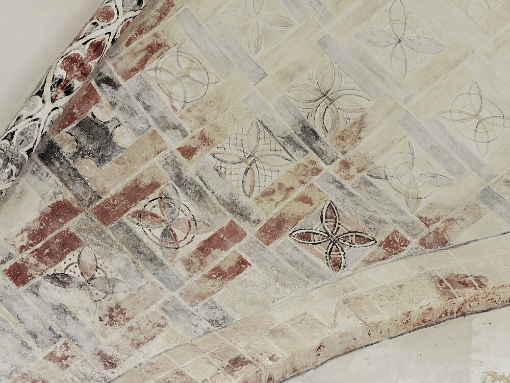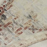 Objectenmet "muurschildering id:1 architectuurpolychromie met baksteenimitatie, vlechtwerkpatronen en geometrische motieven"