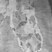 schetslijnen ingekrast, baksteenimitatie op de wanden deels rechtstreeks met verf aangebracht.