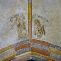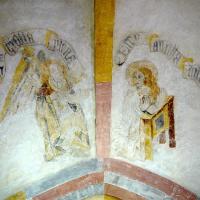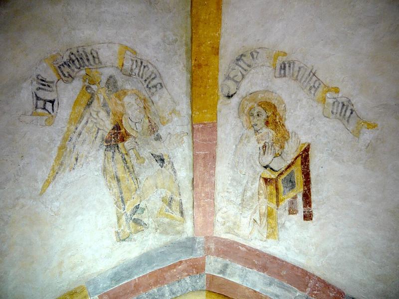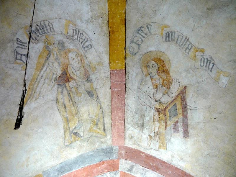 1 Annunciatie; banderollen met,Ave gratia plena' en ,Ecce ancilla d[omi]ni'; schilderingen sterk reconstruerend hersteld tijdens kerkrestauratie 1941-1944