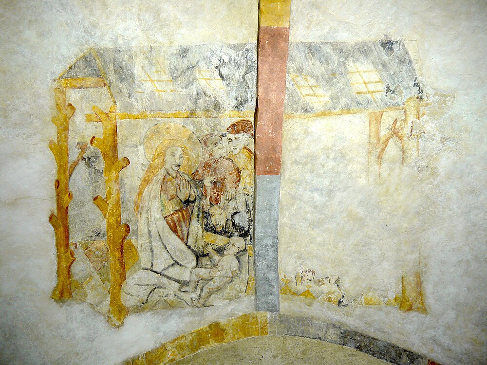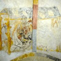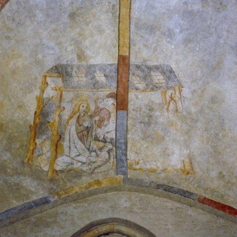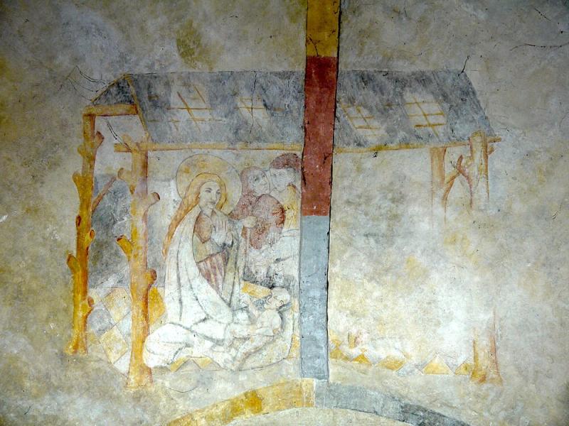 Objectenmet "muurschildering id:2 Geboorte van Christus (type,Adoravit quem genuit'), met herders, os en ezel."
