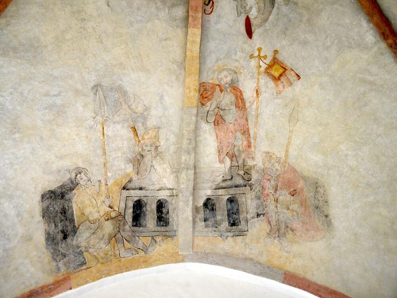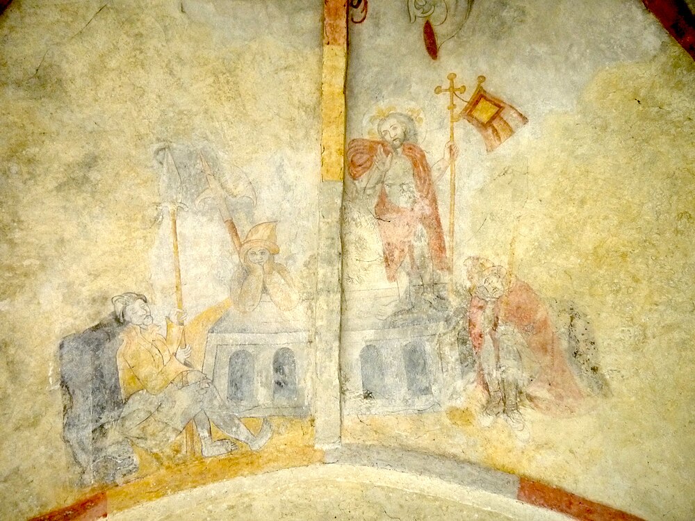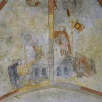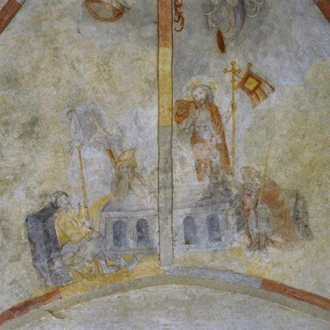 Objectenmet "muurschildering id:8 Opstanding; Christus met kruisnimbus en kruisbanier, slapende soldaten."