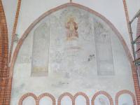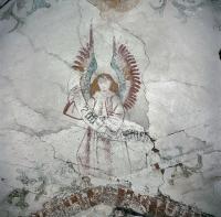 8 Laatste Oordeel (de centrale Christusfiguur door inbreken raam verloren gegaan): bazuinende engelen, rechts knielende Johannes de Doper - vermoedelijk deel van een Deësis - en hellemuil, links Petrus bij hemelpoort 8 Resten Laatste Oordeel (de centrale Christus-figuur door inbreken raam verloren gegaan): bazuinende engelen, rechts knielende Johannes de Doper - vermoedelijk deel van een Deësis - en hellemuil, links Petrus bij hemelpoort -