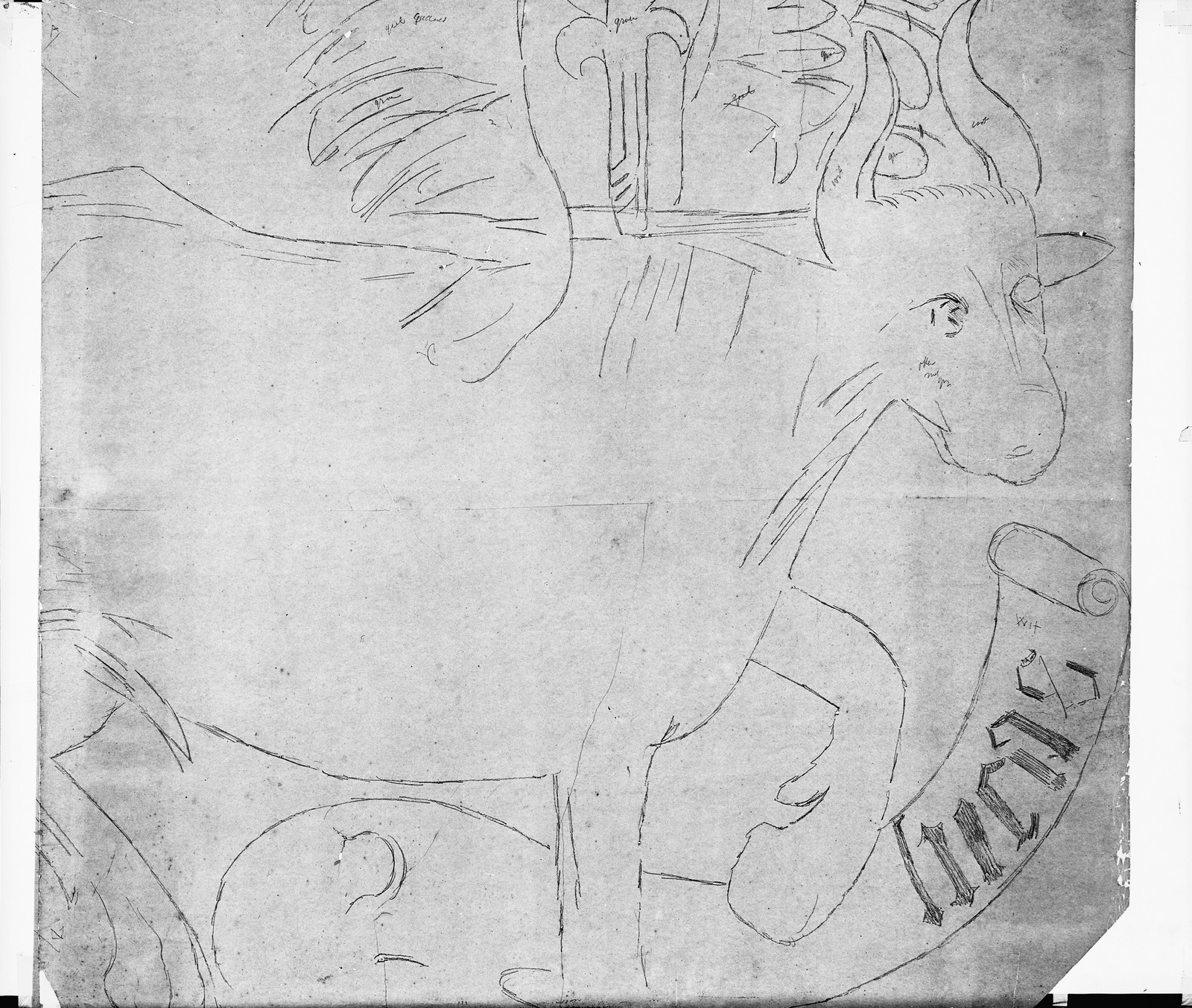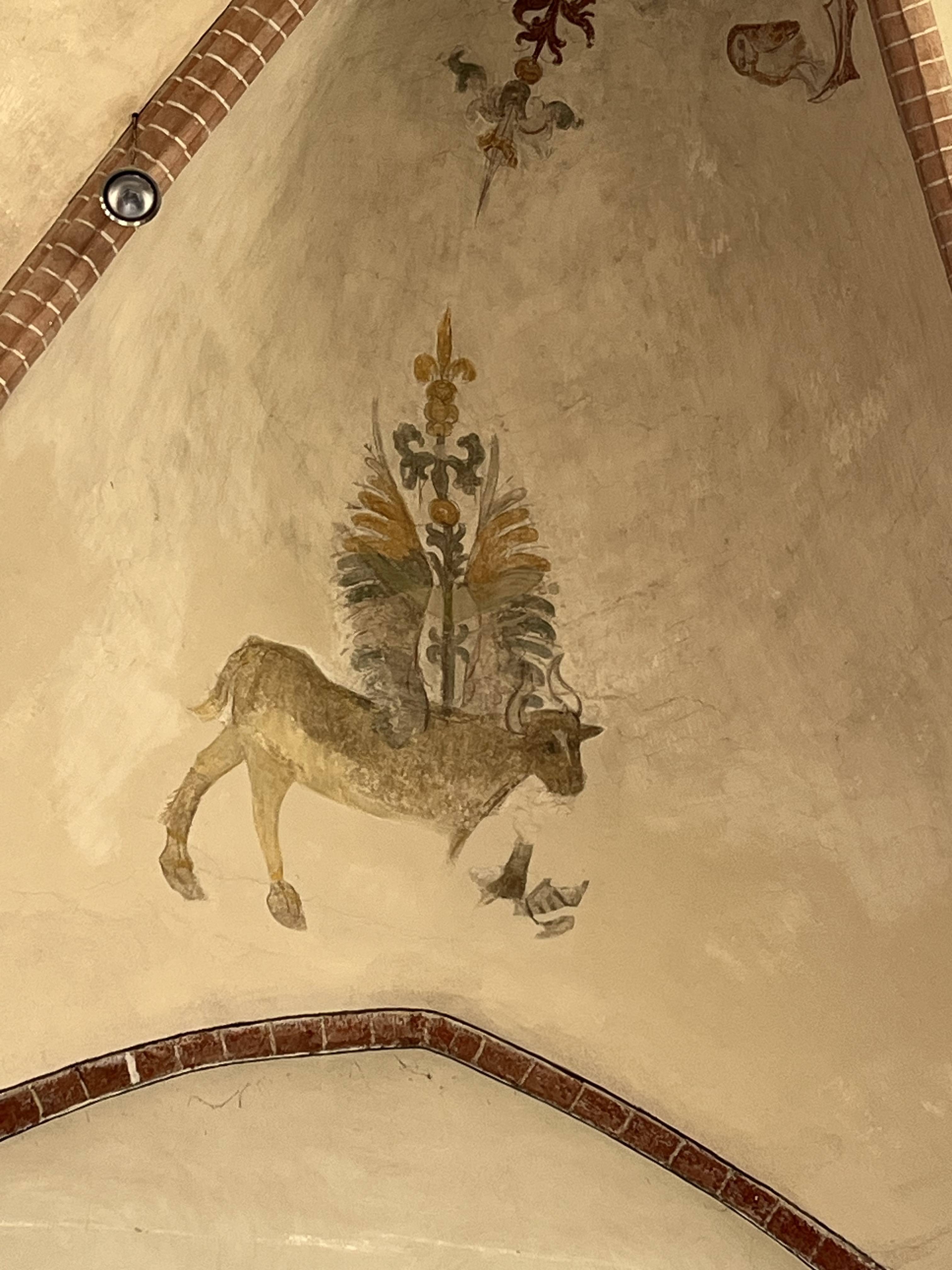 Een gevleugelde os, het symbool van de evangelist Lucas, is geschilderd in geelbruine oker. Midden op de rug is een staafvormig ornament geschilderd dat overeenkomt met de ornamenten die geschilderd zijn bij de gewelfsluiting. Niet de gehele schildering is bewaard gebleven. De achterpoten zijn gedeeltelijk verdwenen, maar hier is de afbeelding voorzien van een nieuwe pleisterlaag waarop bijschilderingen zijn aangebracht in een lichtere kleur. (bron: Aldus is opgeschilderd. Middeleeuwse muurschilderingen in Friese kerken 1100 - 1600)