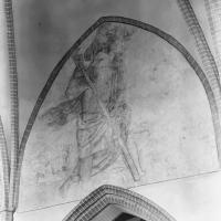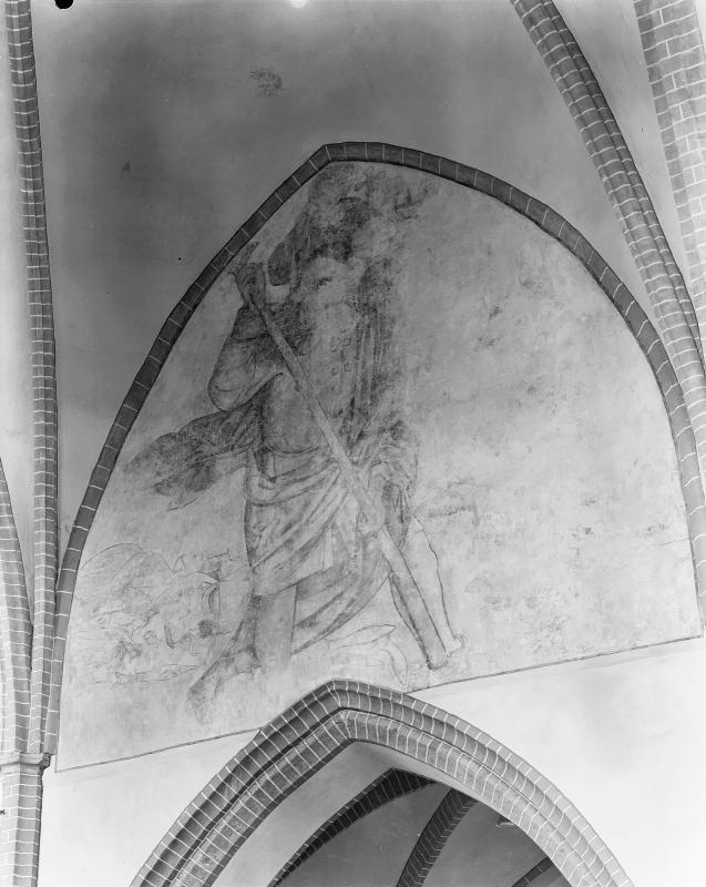 Okers op kalk. De schildering is niet kort na het totstandkomen van de kerk aangebracht, omdat onder de Christoffelschildering een andere schildering werd aangetroffen tijdens de restauratie van de schildering in 1967.