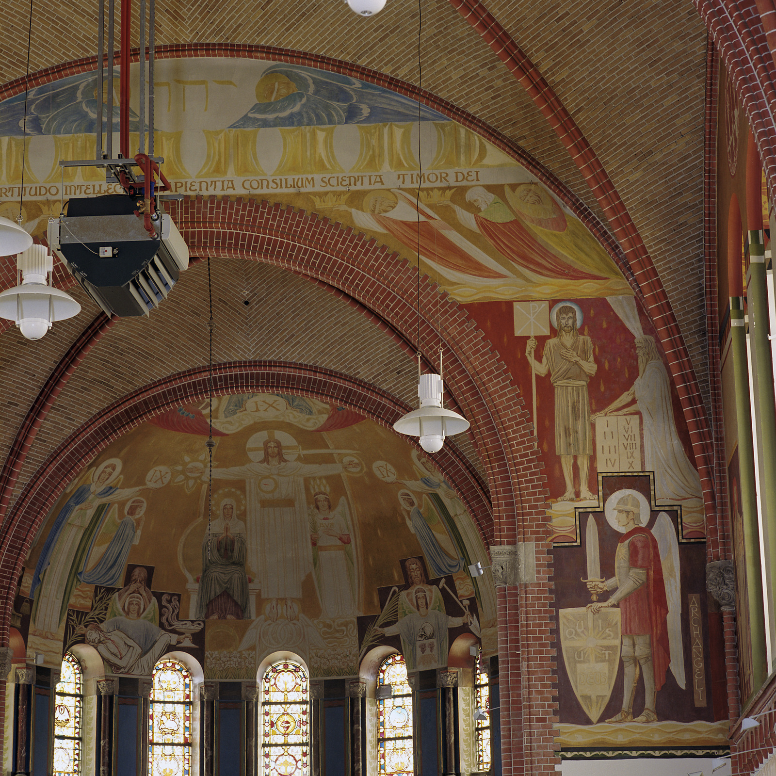Muur- en gewelfschilderingen in Juvenaat broeders van O.L. Vrouw onbevlekte ontvangenis Maastricht, Maastricht; Detail rechtsonder geschilderd op de triomfboog van de Juvenaatskapel [kleurengamma: Wisselend: bij de aardse figuren gedempt, bij de hemelse figuren helder: Riegls dichotomie 'Genade van de steiger'] [staat: Goed (in het recente verleden is het werk geretoucheerd door een huisschilder).]