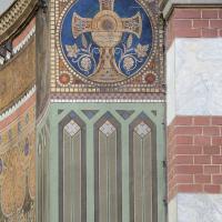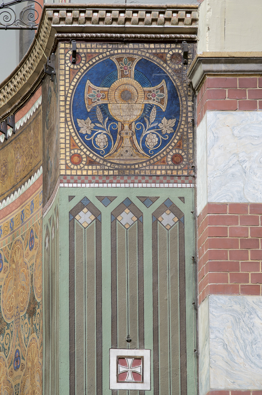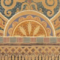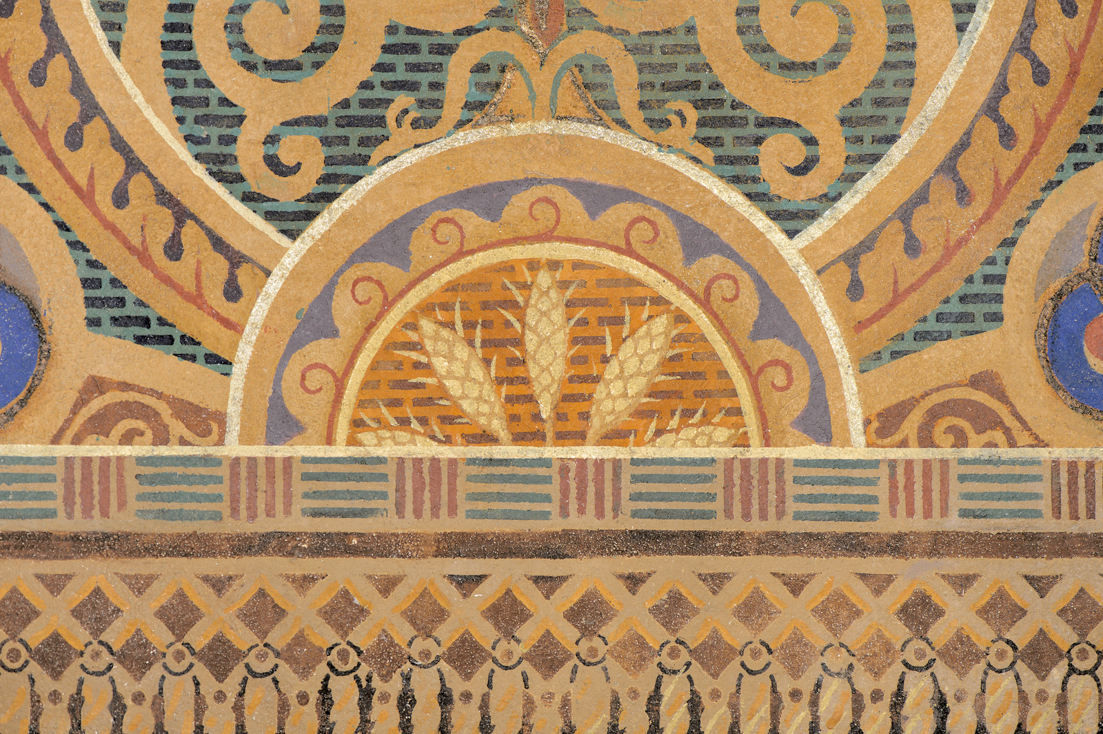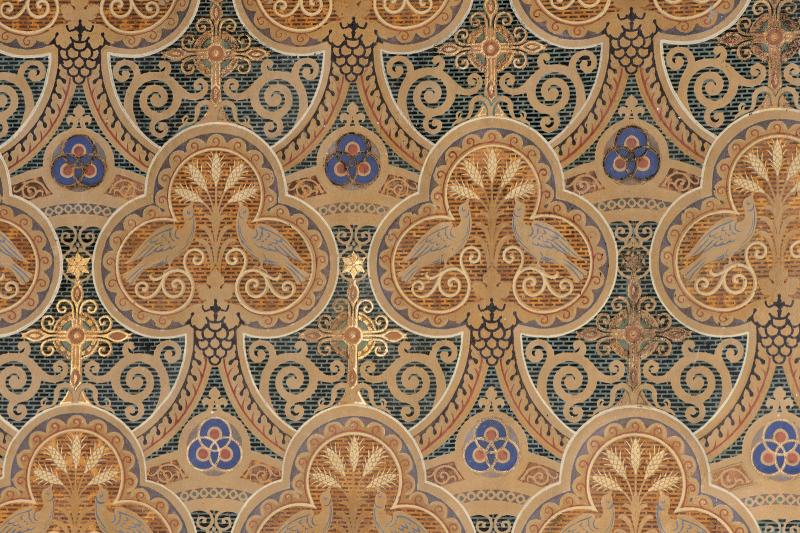 Muurschildering in O.L. Vrouwe Rozenkrans / Obrechtkerk, Amsterdam; Tapijtachtige decoratie met driepassen waarin vogels die van korenaren eten, druiventros eronder, franje. [techniek: olieverf op pleister] [staat: Gerestaureerd 2005-2009]