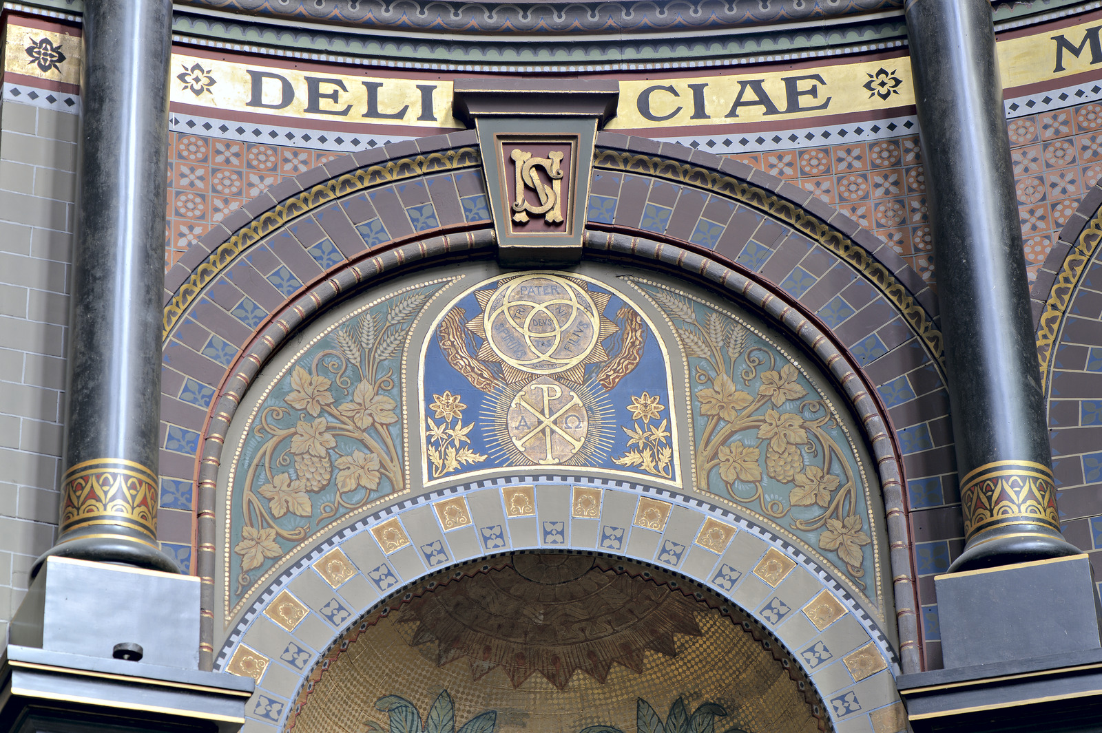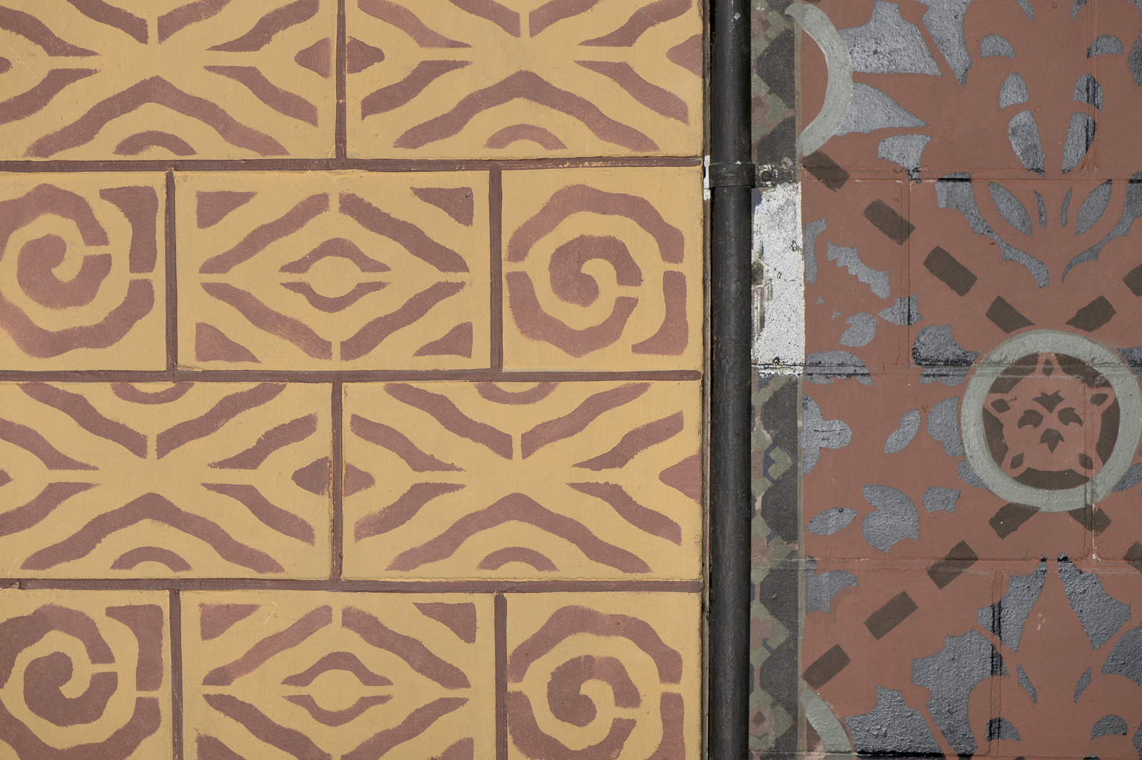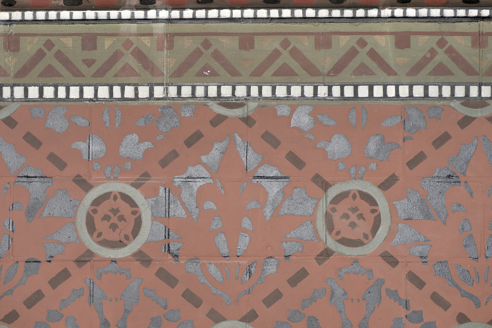 - Decoratieve uitmonstering met florale elementen en baksteenimitatie in Nicolaas, Amsterdam; ^ [techniek: olieverf op pleister] [staat: Gerestaureerd 1999]