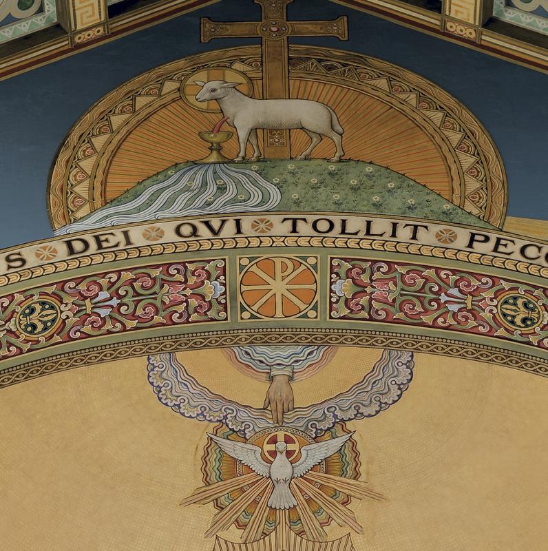 Muurschildering in O.L. Vrouwe Rozenkrans / Obrechtkerk, Amsterdam; Het Lam Gods op de triomfboog in de Obrechtkerk te Amsterdam (1921). Heel bijzonder is de driedimensionale sprong van Lam Gods via Christusmonogram naar de hand Gods en zo verder naar de heilige Geest en Christus. Het volledige opschrift luidt: ‘Ecce Agnus Dei qui tollit peccata mundi’ (zie hier het Lam Gods dat wegneemt de zonden der wereld), dat in de liturgie gebeden wordt vlak voor het ter communie gaan. [techniek: olieverf] [staat: Gerestaureerd 2005-2009]