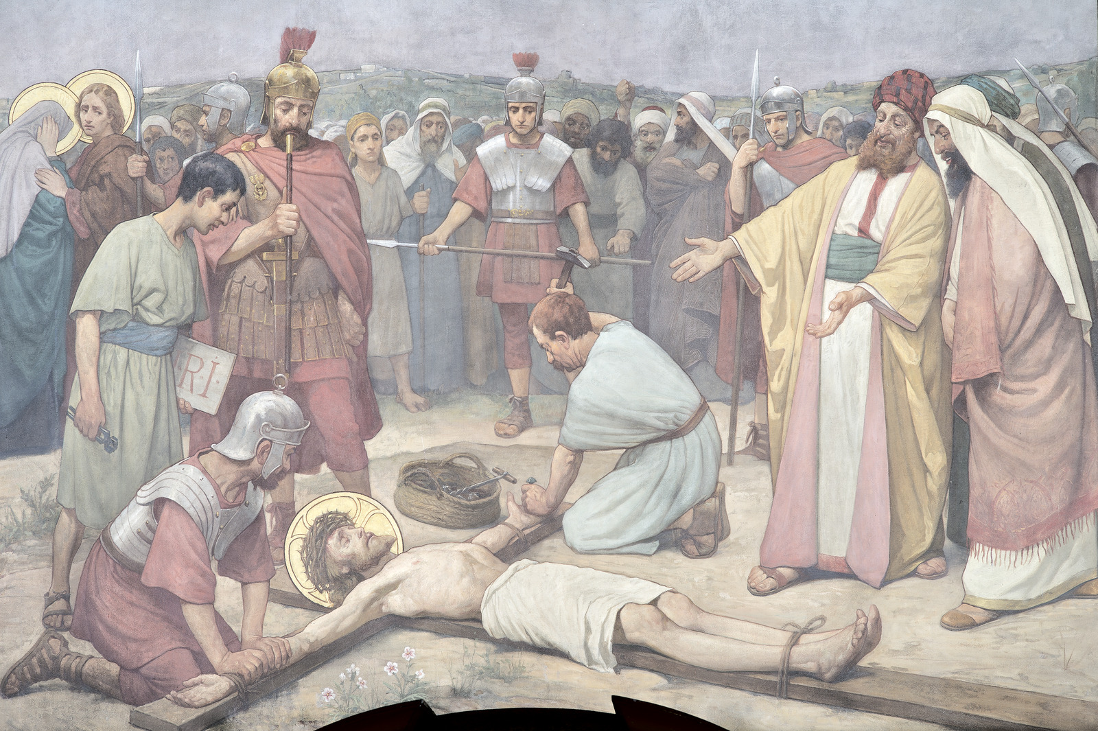 Muurschilderingen in Nicolaas, Amsterdam; Om te voorkomen dat het accent meer op het lijden dan de verlossing zou komen te liggen, is Christus niet al te smartelijk weergegeven. Rechts bespotten de Farizeeën hem met de woorden dat hij, als hij echt God is, vast wel van het kruis kan komen. Linksboven houdt Johannes Maria weg die het niet meer kan aanzien. De ook in de vorige scène aanwezige leerlingtimmerman met het bord INRI kijkt argeloos nieuwsgierig toe wat zijn leermeester doet. De Romeinse soldaat houdt zijn speer dwars om de menigte op afstand te houden. Jan Dunselman heeft zich volledig ingeleefd en vervolgens uitgeleefd om dit tafereel zo echt mogelijk in beeld te brengen [techniek: olieverf] [staat: Gerestaureerd 1999]