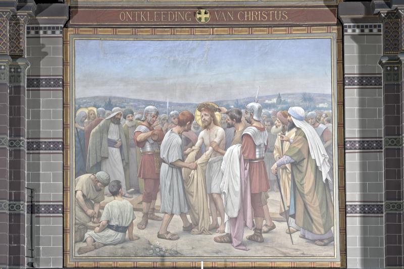 Muurschilderingen in Nicolaas, Amsterdam; Tiende statie in de Nicolaaskerk te Amsterdam met als oudtestamentische voorafschaduwing daarboven Jozef die door zijn broers wordt ontkleed en in de put geworpen. [techniek: olieverf] [staat: Gerestaureerd 1999]
