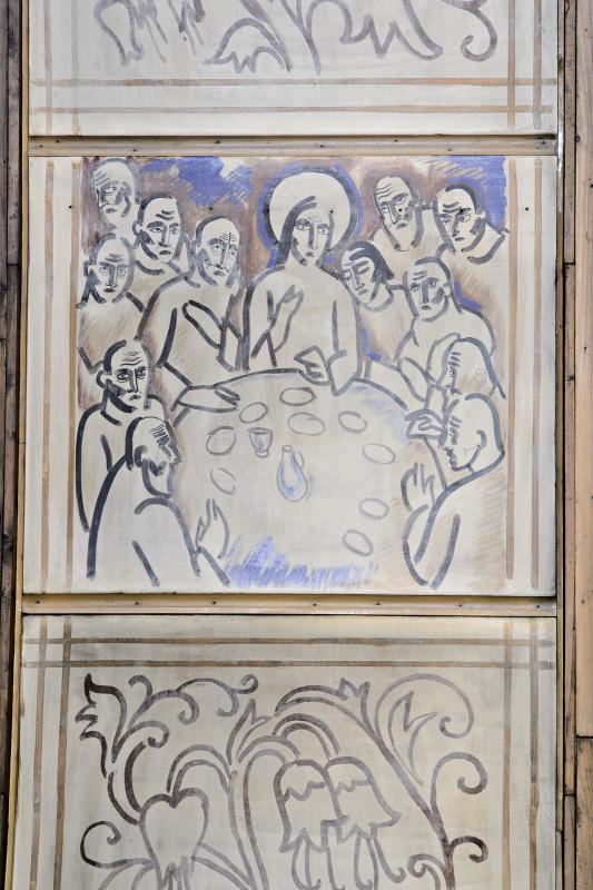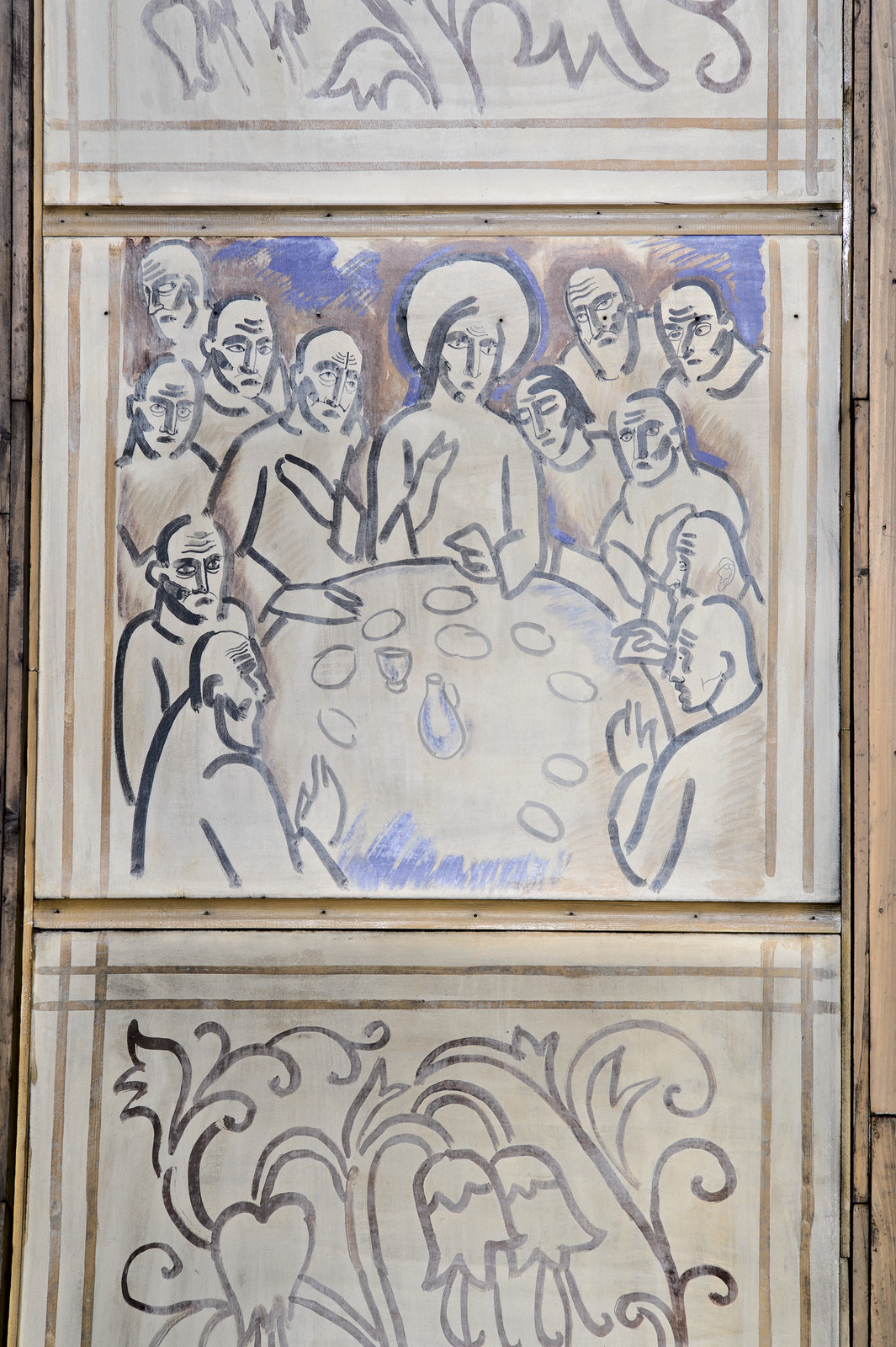 - Muurschildering in Vincentius a Paulo, Rumpen; Het laatste avondmaal als een van de taferelen (1929) op het tongewelf in de koortravee van de Vincentius a Paolokerk te Rumpen, maakt gebruik van het historisch presens. Dit gebouw is het eerste kerkelijk ontwerp van Frits Peutz (1924).