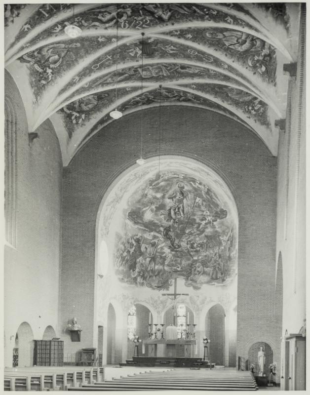 - Muurschildering in Hubertus, Genhout; schip, verschillende figuren werden geportretteerd naar voorbeeld van door Eyck gewaardeerde personen