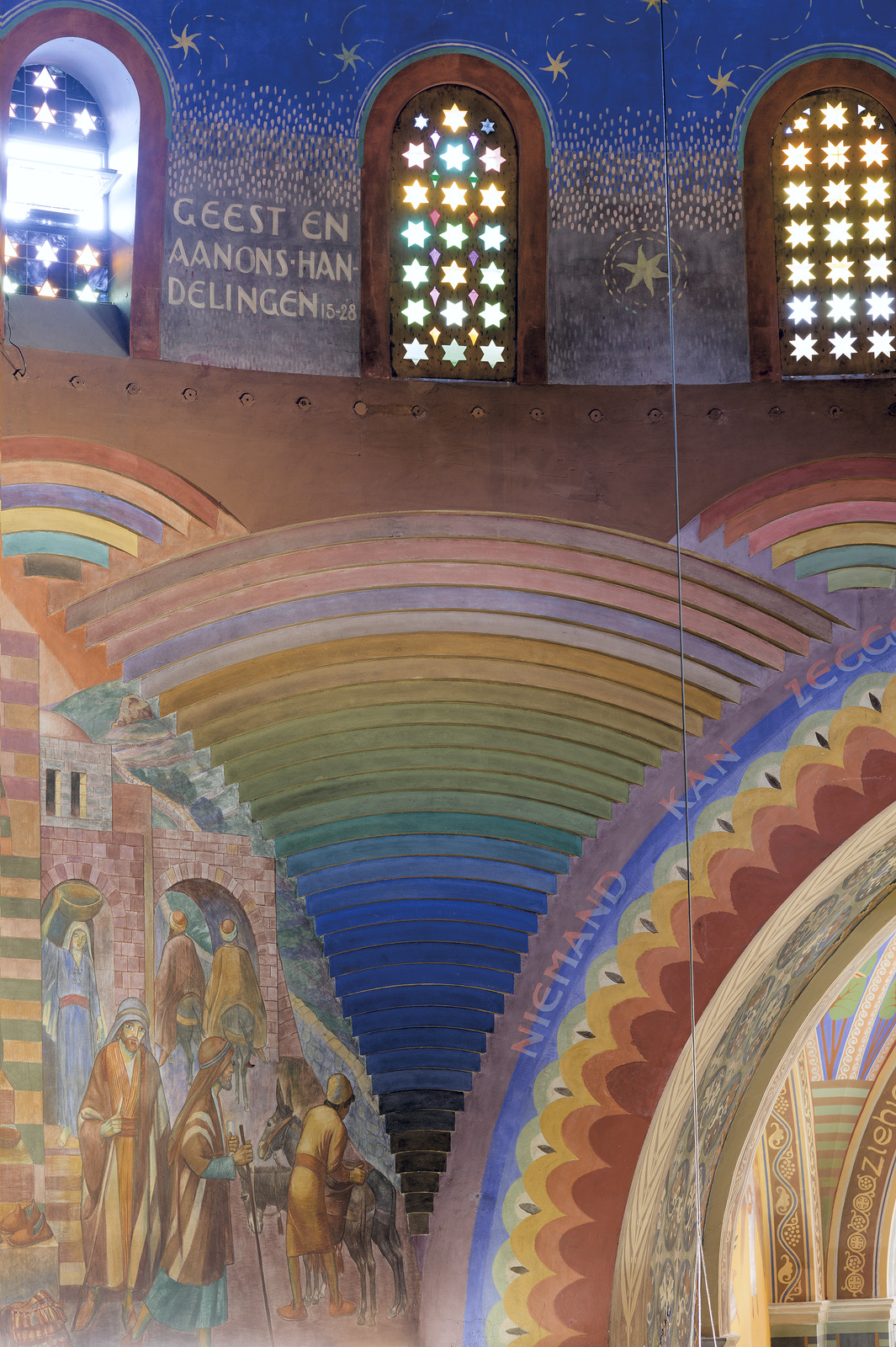 Muurschilderingen in Antonius van Padua/ Cenakelkerk, Heilig Landstichting; Een van de uitgemetselde pendentieven met de kleurenwaaier van de schilderingen. Links het vertrek van enkele apostelen en zendelingen naar Antiochië. Zuidoostelijk muurpaneel van de Cenakelkerk van de Heilig Landstichting [techniek: Keimverf] [staat: Goed]
