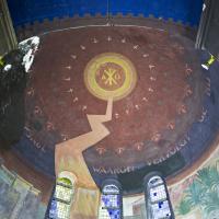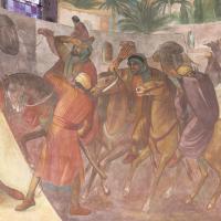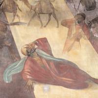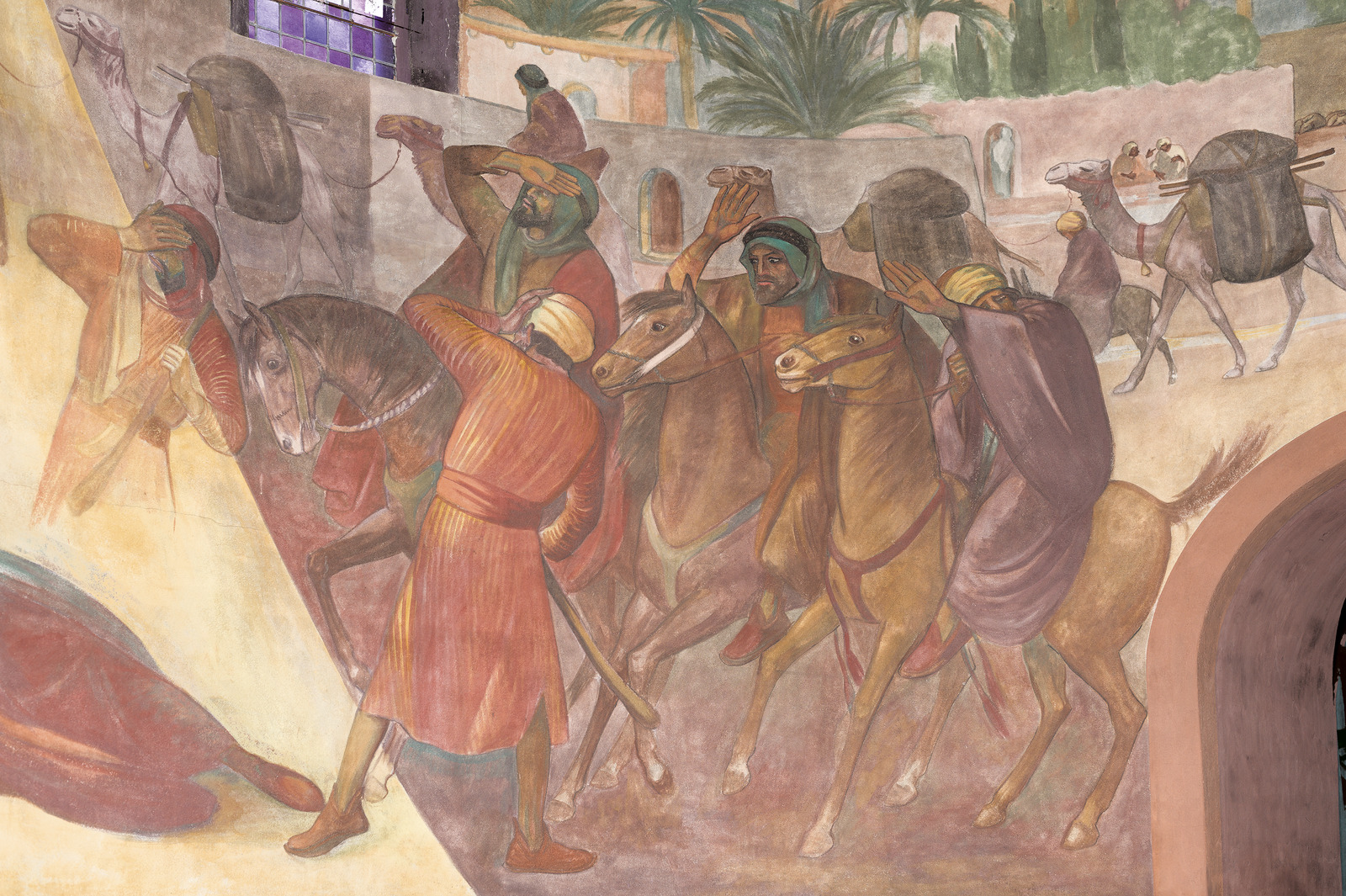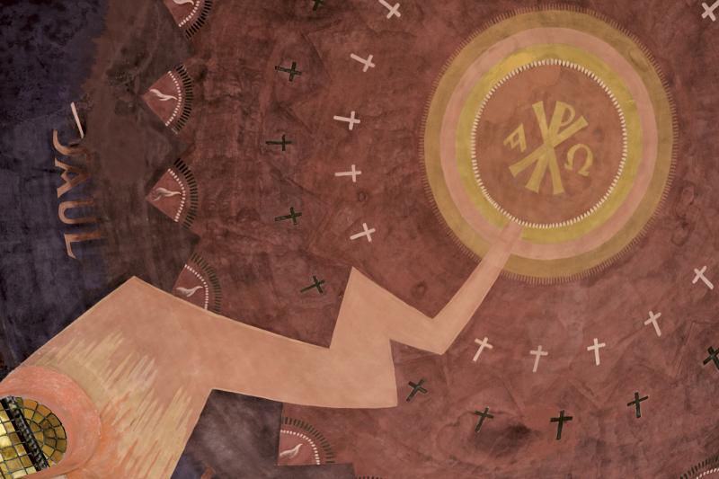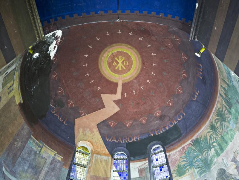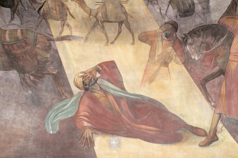 Muurschilderingen in Antonius van Padua/ Cenakelkerk, Heilig Landstichting; De val van Saulus, de latere apostel Paulus. a. Momentopname van de lichtflits die vanuit de koepel – symbolisch de hemel – Saulus raakt, is in de monumentale schilderkunst van het interbellum zonder precedent. b. Het diagonaalsgewijs terugdeinzen van de omstanders, de geschrokken paarden en de karavaan die op de achtergrond verder trekt: het past allemaal in de traditionele eis van de historieschilderkunst om een zo overtuigend mogelijk beeld op te roepen. [techniek: Keimverf] [staat: Goed]