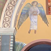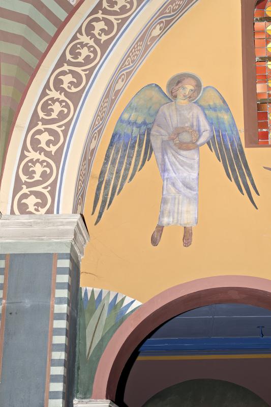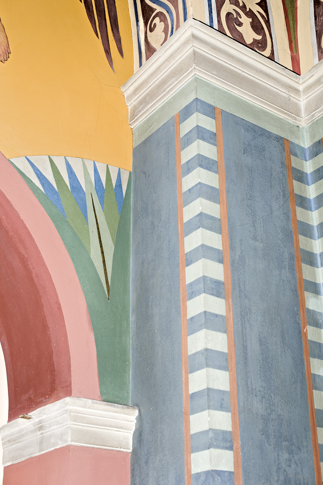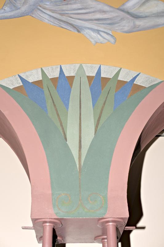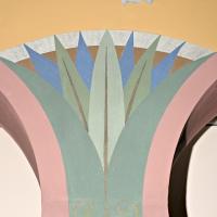 Muurschilderingen in Antonius van Padua/ Cenakelkerk, Heilig Landstichting; Ornamenten in de koortravee van de Cenakelkerk: a. Architectuurondersteunend blokmotief op de pijler. b. Egyptisch plantmotief. c. Rank met monochroom gestileerde passiebloemen. [techniek: Keimverf] [staat: Goed]