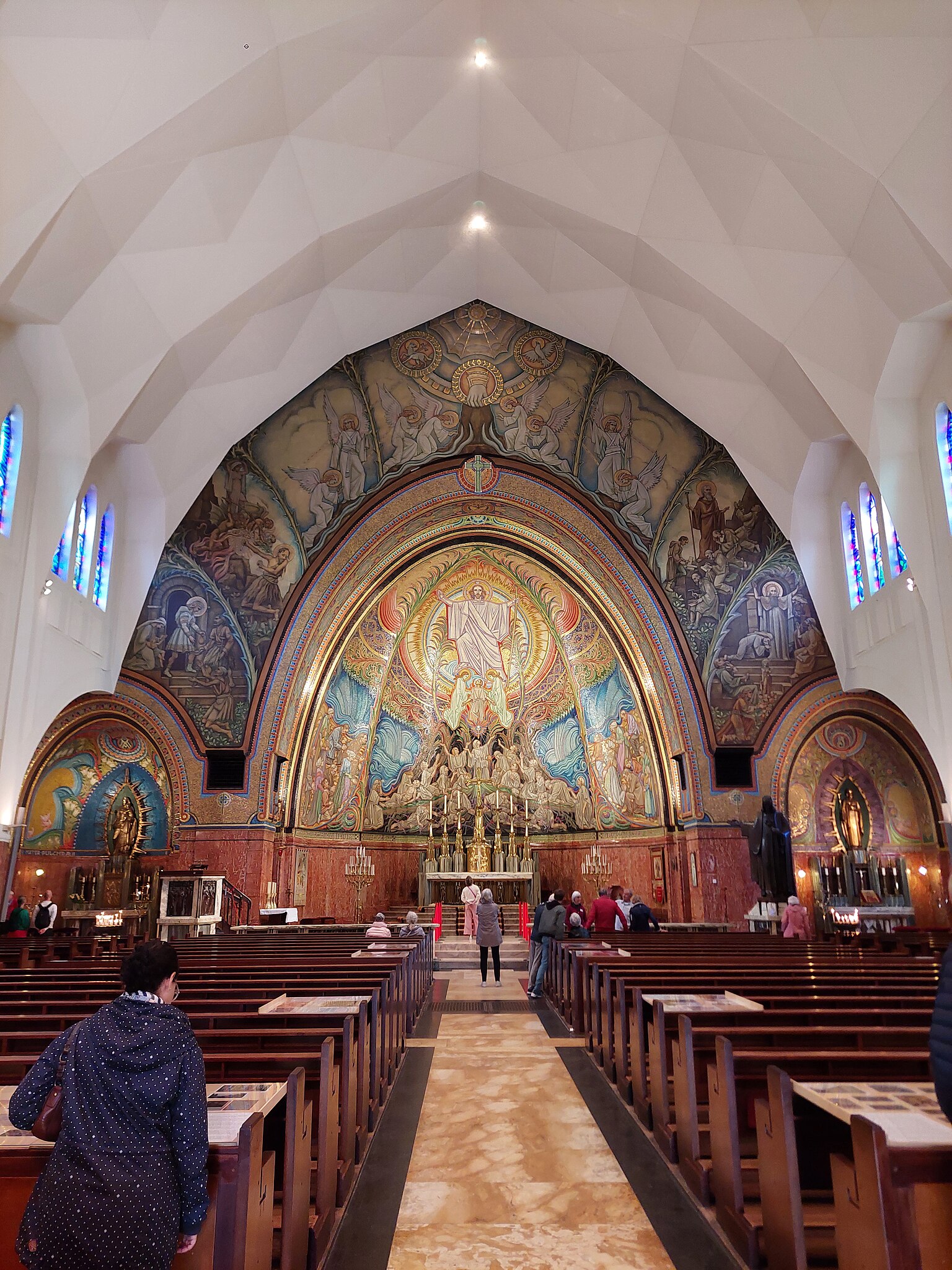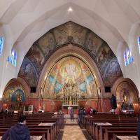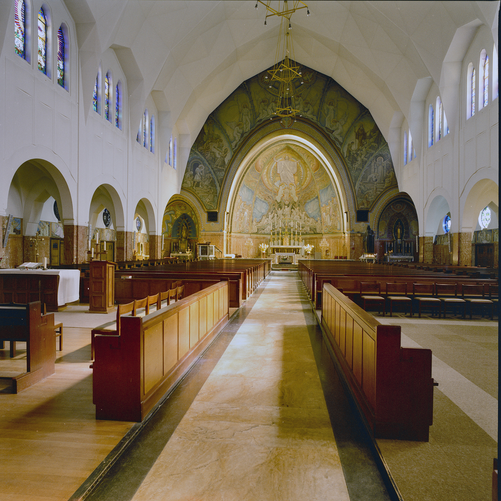 Muurschildering in Antonius Abt, Den Haag (Scheveningen); Monografietje Antonius-Abtkerk, p. 15: Leo van Haalen was een leerling van Anton Molkenboer: hij voerde in 1950 het ontwerp uit dat Molkenboer in 1927 had gemaakt. a1. Antonius geeft zijn bezittingen weg. a2. De verleiding van Antonius. b1. De stichting van de kluizenaarsorde der Antonieten. b2. Antonius preekt tegen afgoderij en ketterij. [techniek: In keim (monografietje Antonius-Abtkerk); verdaccio | http://www.adolphus.nl/xus/antonbnss.html]