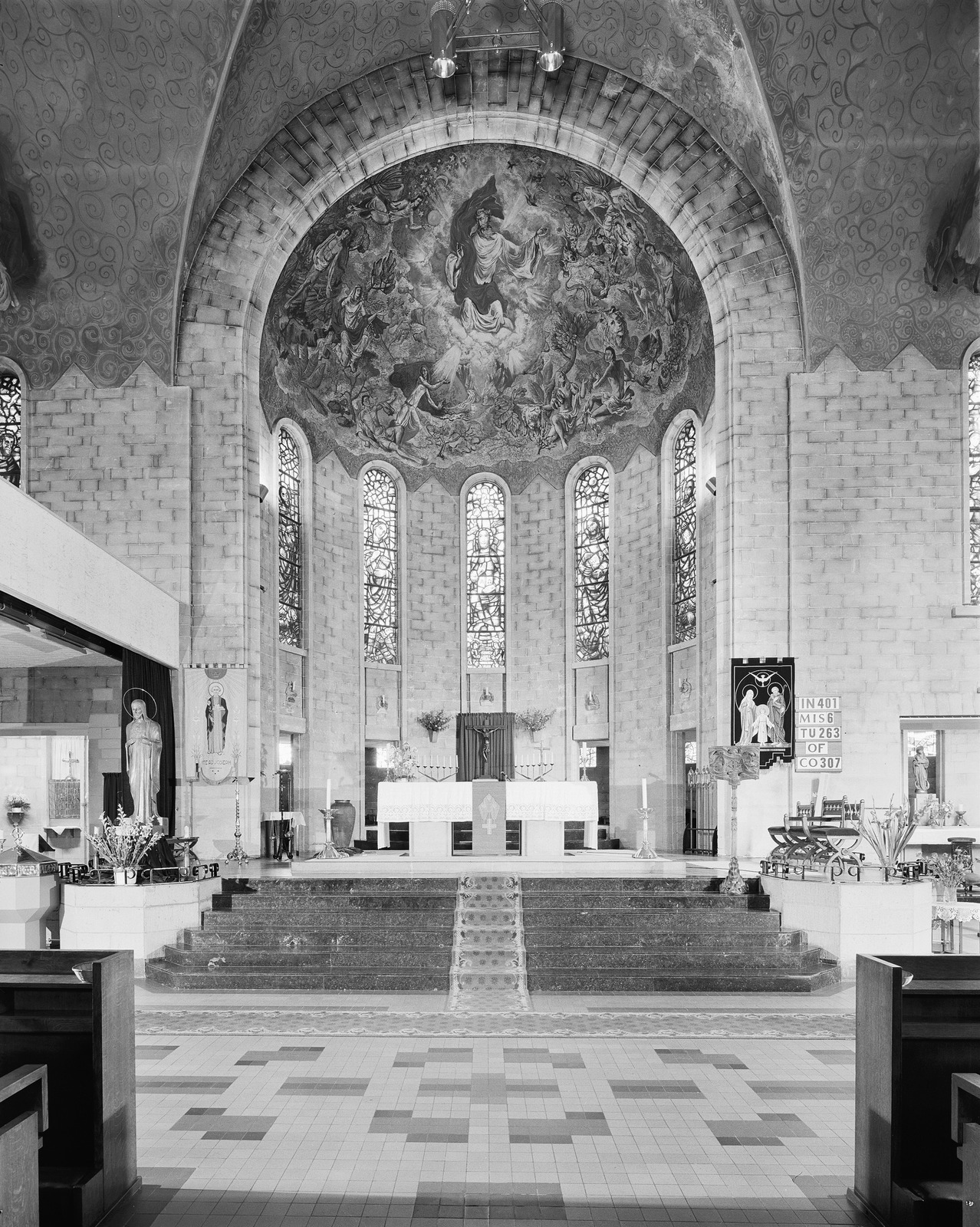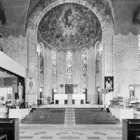 Gewelf- en muurschildering in Jozef, Broekhem (Valkenburg aan de Geul); De glazen daaronder zijn van de hand van Henri Jonas (1931): hierin wordt Christus als alfa en omega omgeven door de vier evangelisten