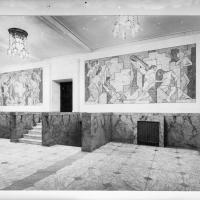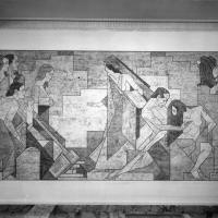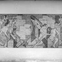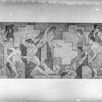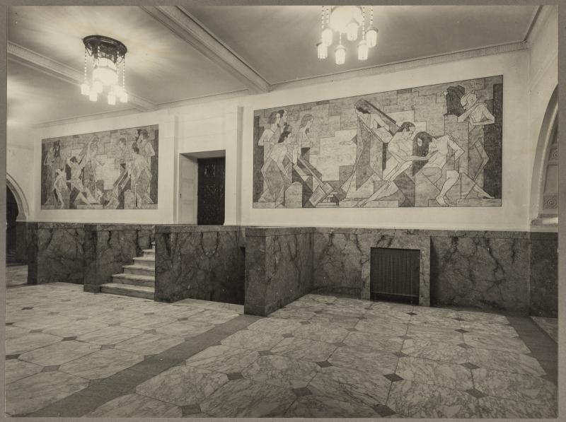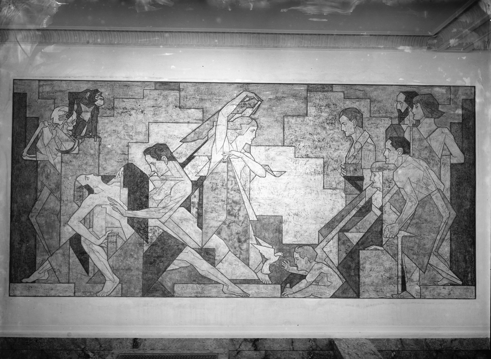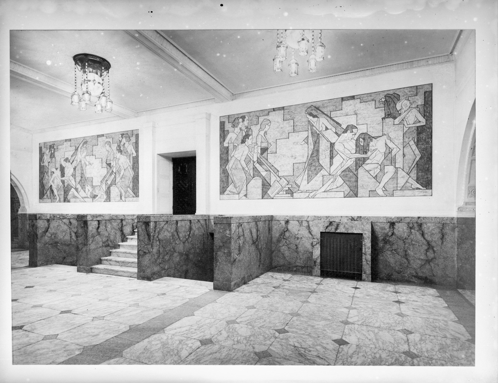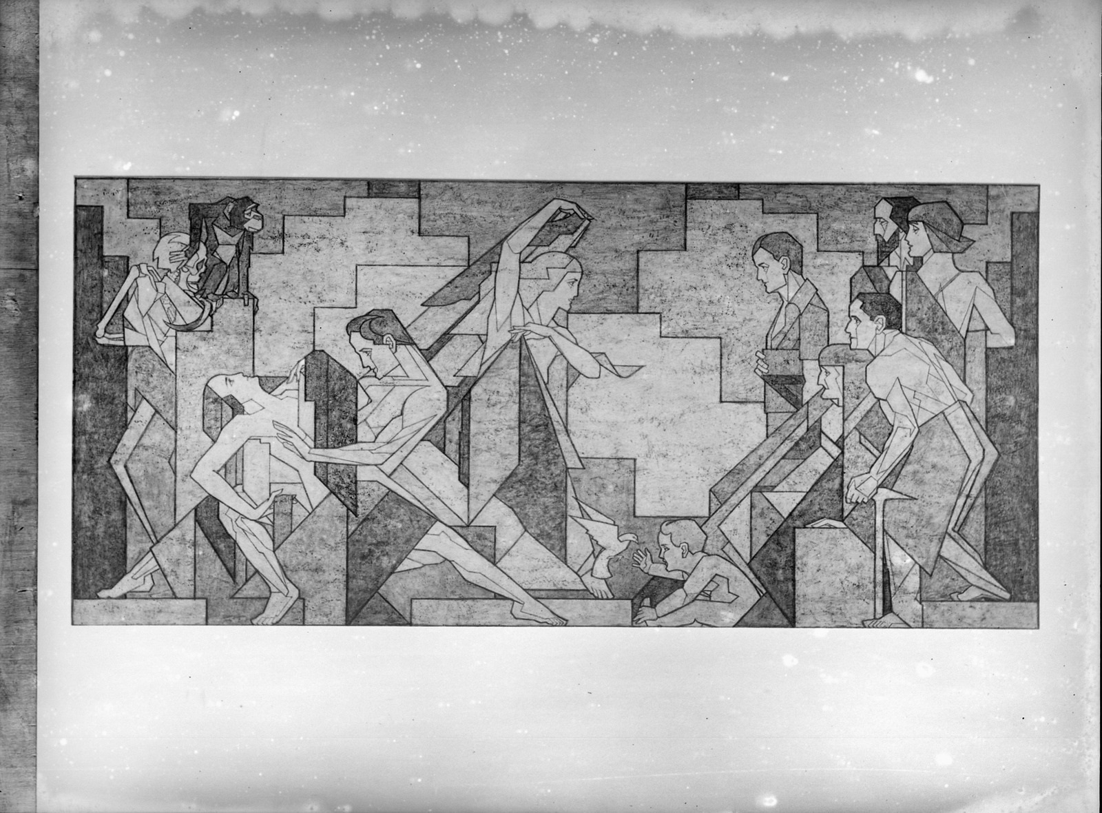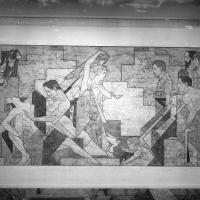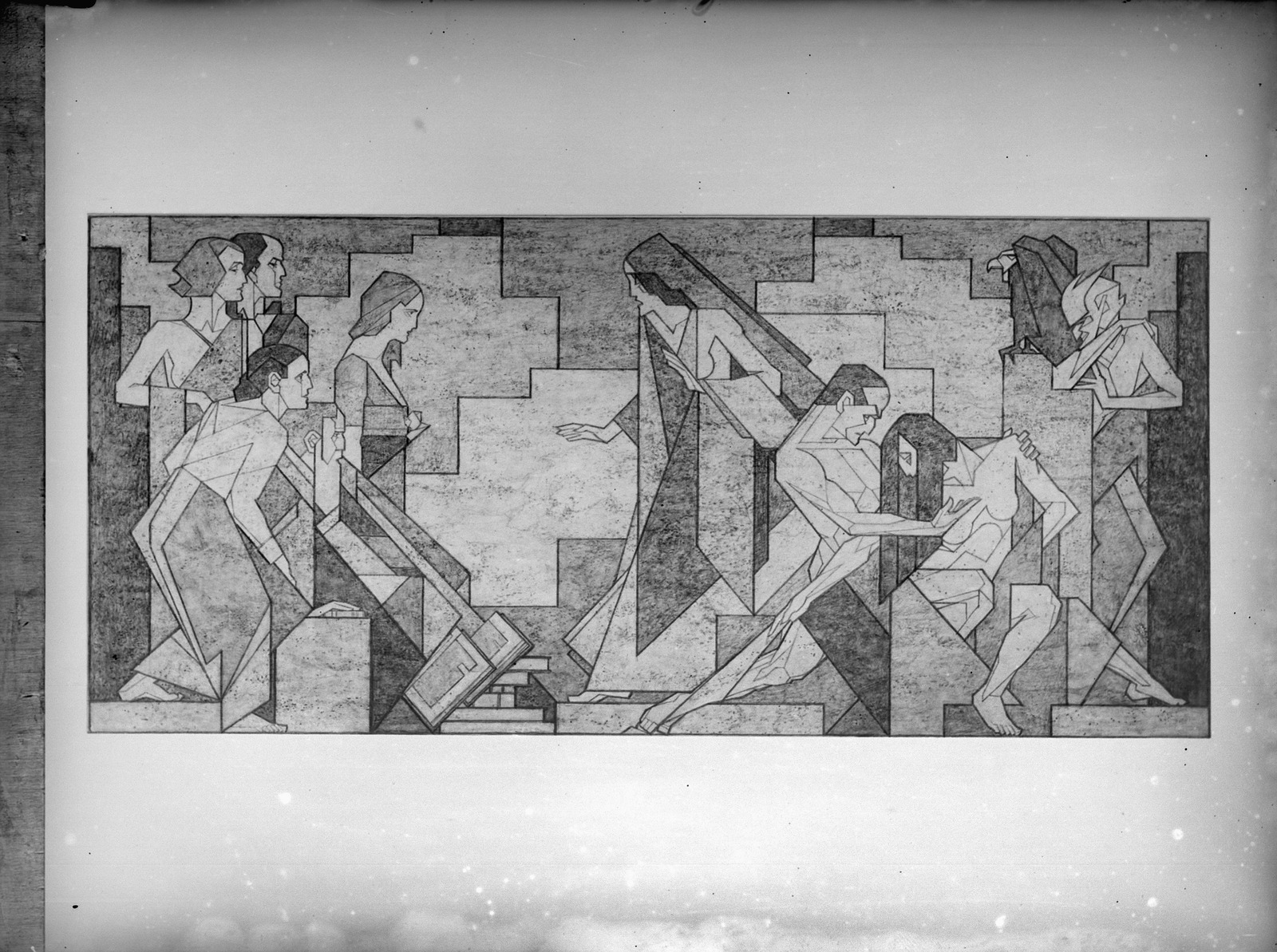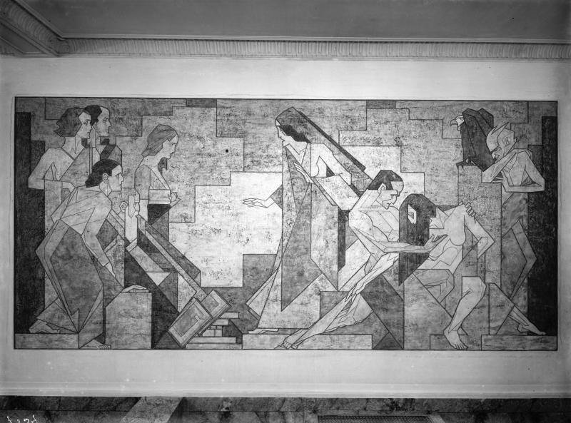 Muurschilderingen in de Koninklijke Schouwburg van Den Haag, mogelijk uitgevoerd in caseïneverf. Linse wordt als een van de weinige ‘overigen’ – dus buiten de kopstukken – door Albert Plasschaert besproken. Plasschaert meende: ‘In een wandschildering wordt een groep niet uitgedrukt alsof zij een photographische opname was van een menigte; soberheid is in overeenstemming met de bouwkunstige uitdrukking; Linse begreep dit beter; ’t zij hij een zwierig lijnenschema een abstracte versiering gaf, ’t zij hij in zijn wandschildering in den Haagschen Schouwburg in sterk-symmetrische groepeering figuren vereenigde tot een gewenschte beteekenis. Vooral de kleur van deze wandschildering heeft een bekoring; in de koppen, de dragers, de openbare dragers der Ideeën, is hij te schematisch van expressie gebleven; de Idee bezielt niet voldoende’. [techniek: Caseïneverf?]