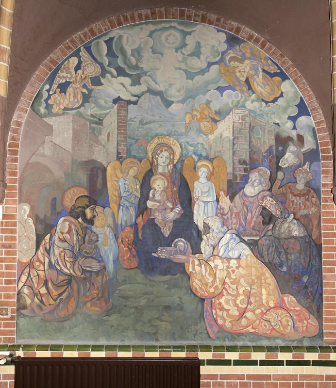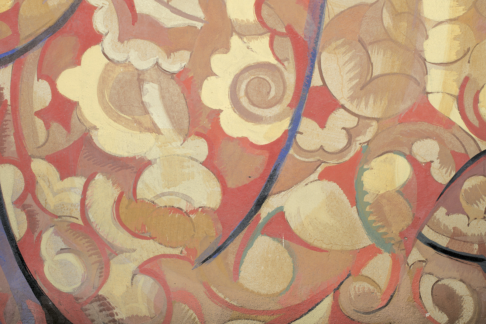 Muurschildering in Doveninstituut, Michielsgestel; Twee details van de kleding van figuren in de schilderingen van de voorhal bij de jongenskapel van het toenmalige doveninstituut van Sint Michielsgestel [techniek: olieverf]