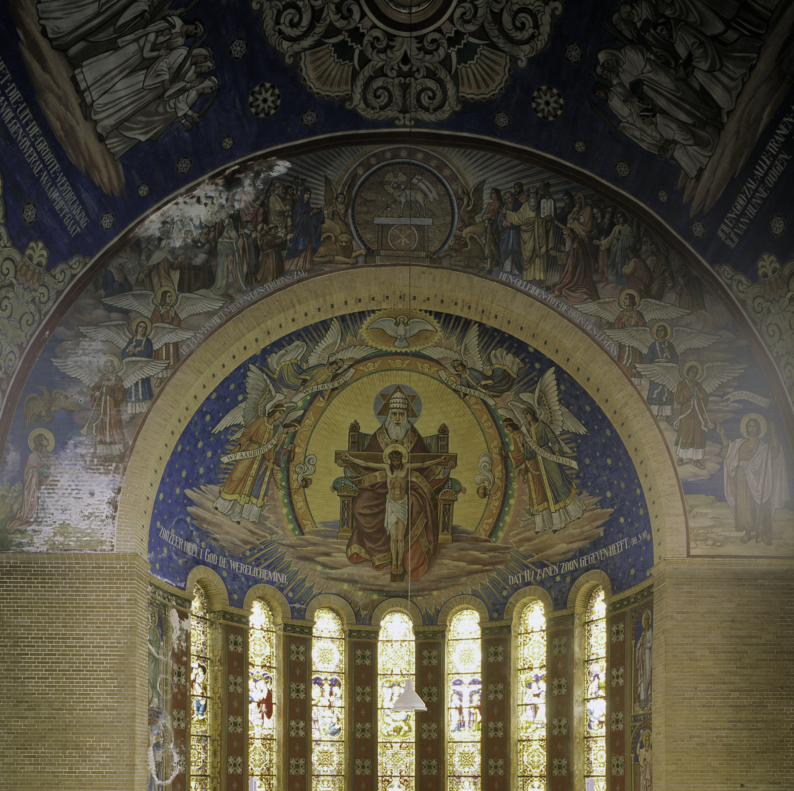 Muur- en gewelfschilderingen in Antonius van Padua (Hoefstraat), Tilburg; MoL: 'Het merendeel der schilderingen is vanaf 1925 vervaardigd door H. Sensen uit Kevelaer. In de schelp van de absis afbeeldingen van de Genadestoel, Johannes verheerlijkt het Lam, Johannes op Patmos en Johannes de Doper. Boven de triomfboog zijn onder meer heiligen afgebeeld die het Lam vereren. Verder zijn er uit de eerste periode veel non-figuratieve schilderingen met gestileerde florale patronen.'