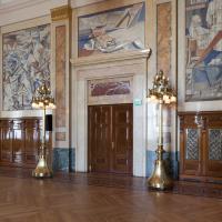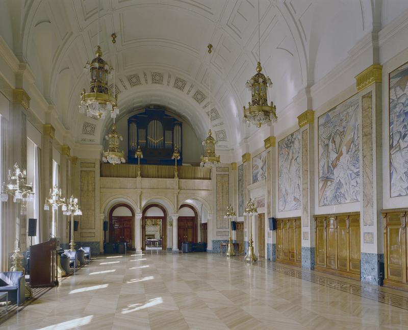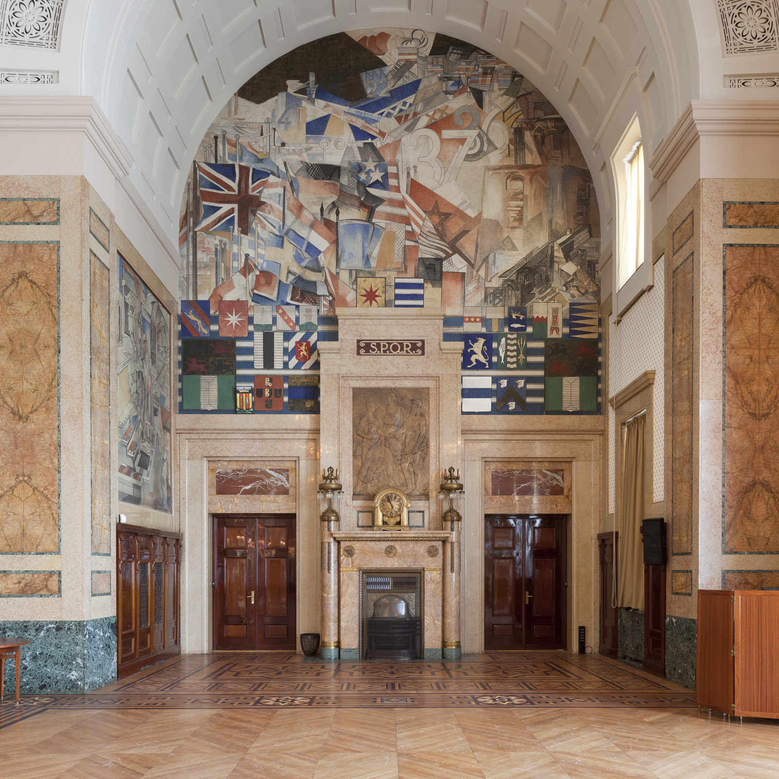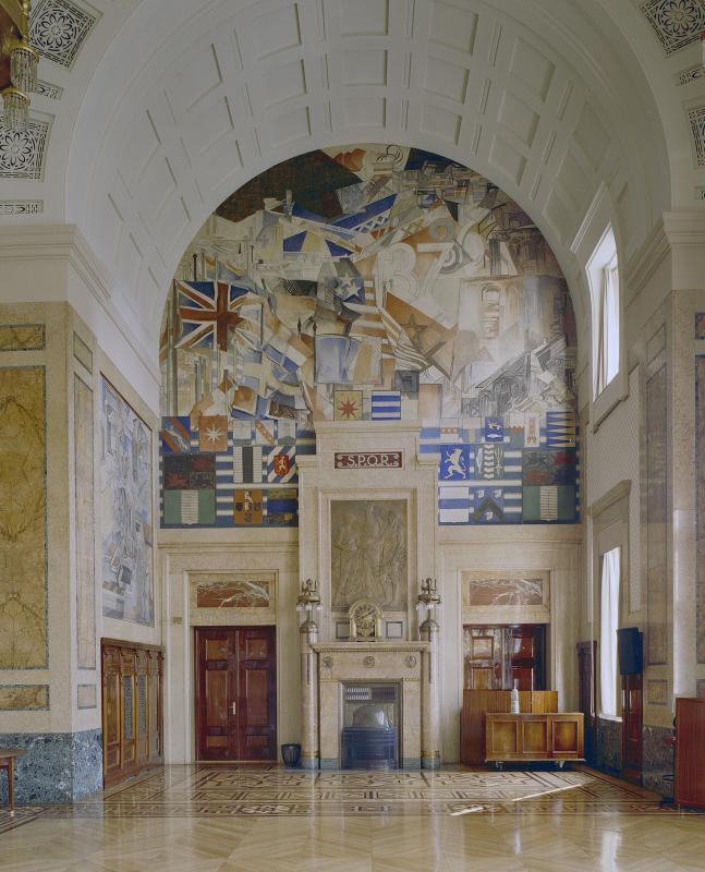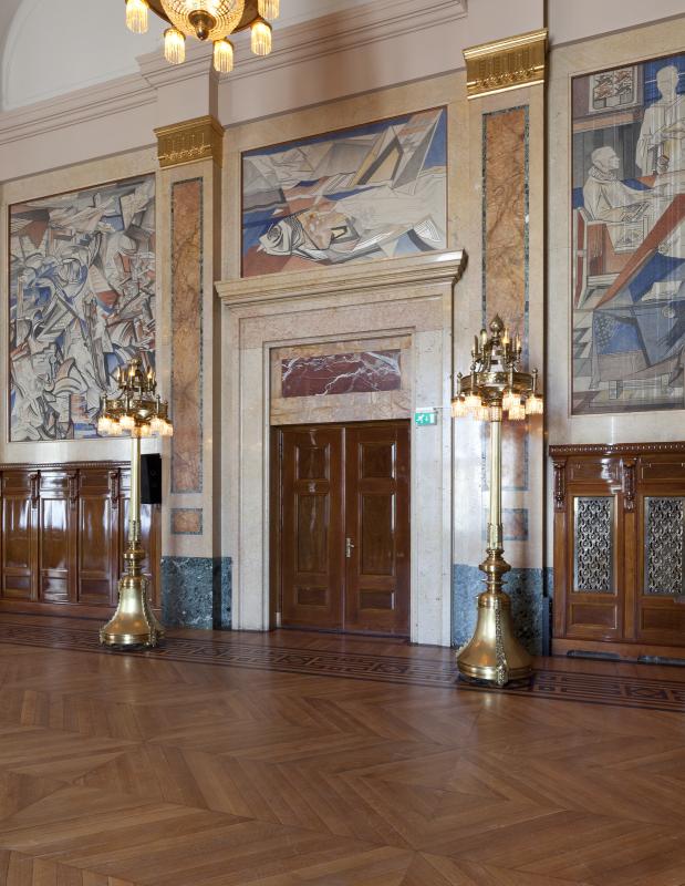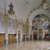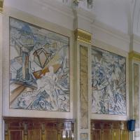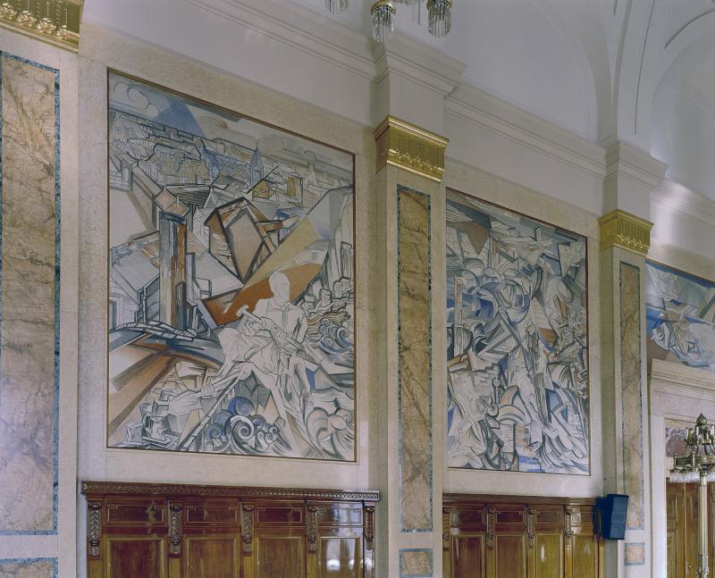 - Muurschilderingen opgenomen in de aankleding boven de lambrisering in Stadhuis, Burgerzaal, Rotterdam; MoL: 'De wandschilderingen boven de mahoniehouten lambrizeringen zijn van Joh. Thorn Prikker.' Datering ontwerp t.p.q. ontleend aan het feit dat AP-1 ze niet vermeld. Op Wikipedia staat dat ze na de oorlog zijn aangebracht, maar blijkens een historische foto zijn ze al in 1929 aanwezig! (Zie site De kunstclub in kolom AS). [staat: Goed]