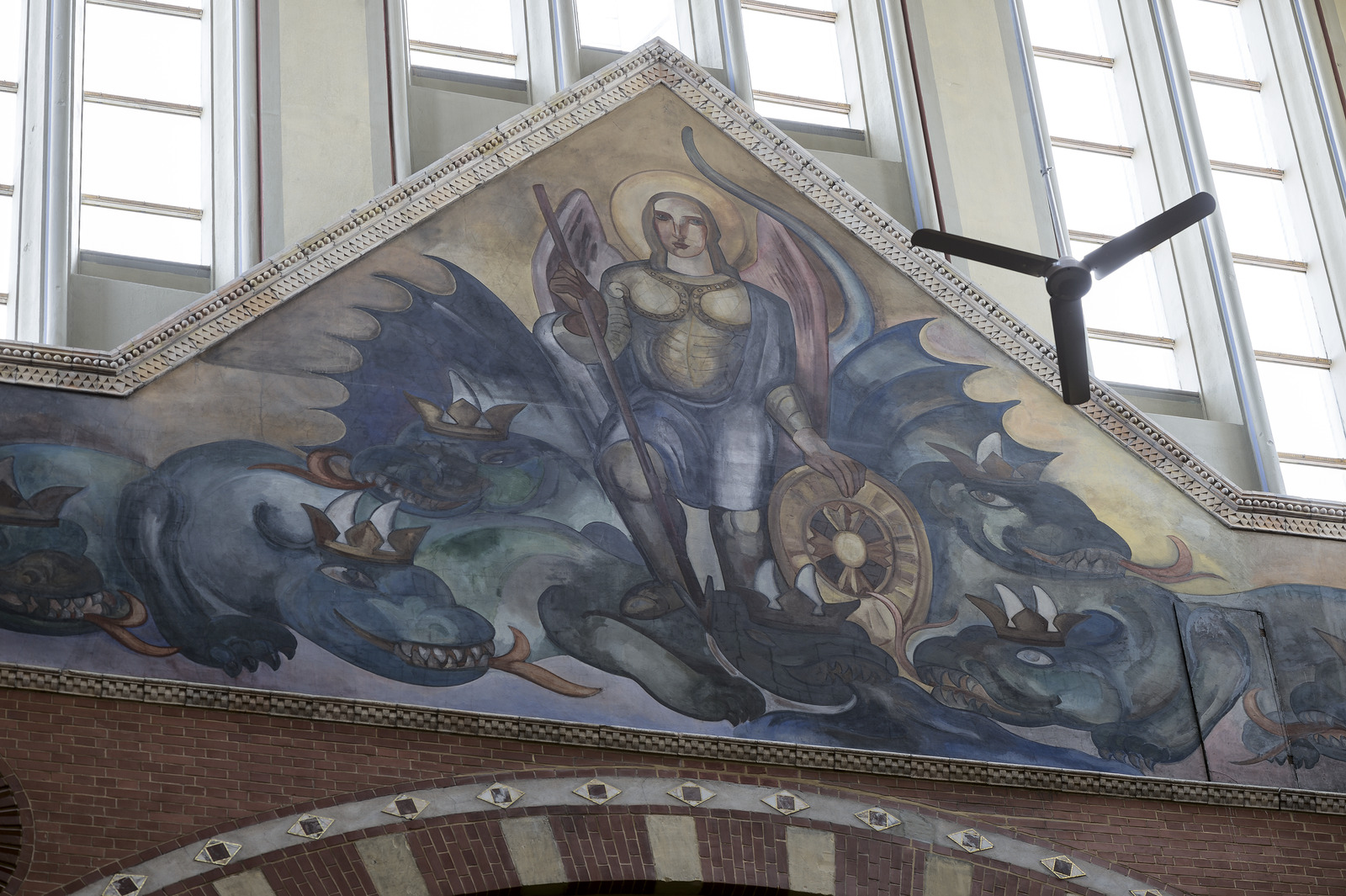Muurschildering in O.L. Vrouwe Rozenkrans / Obrechtkerk, Amsterdam; Michael overwint de zevenkoppige draak op de westkant van de omgang in de vieringtoren van de Obrechtkerk. [techniek: Volgens Meuleman fresco; restauratie: Keimverf] [staat: In 2009 gerestaureerd]