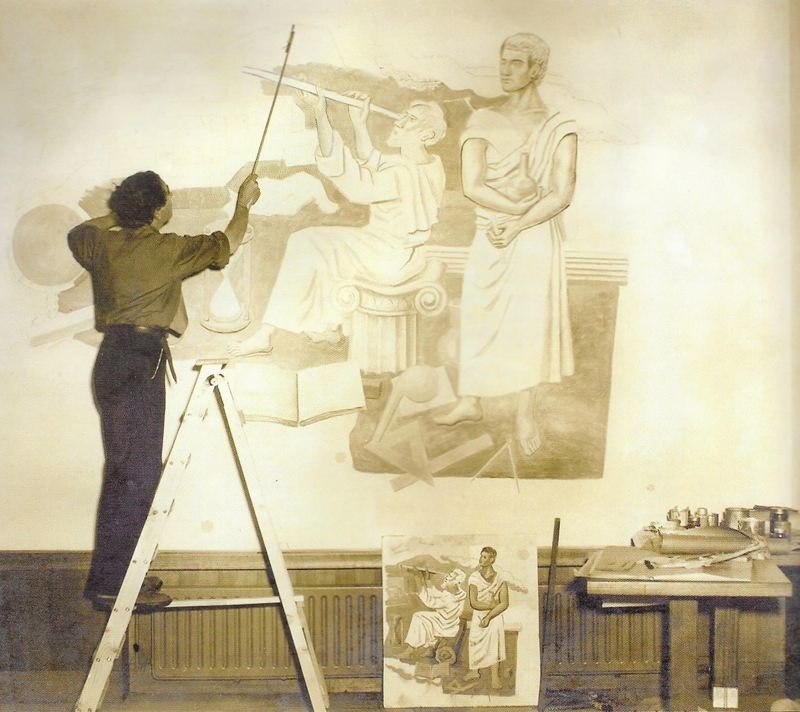 - Muurschildering voorstellende de beeldende kunst en architectuur, de exacte wetenschappen, de filosofie en theologie en de uitvoerende kunsten.