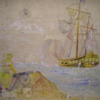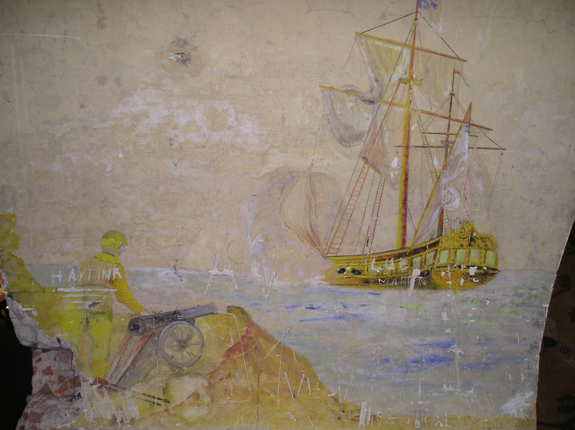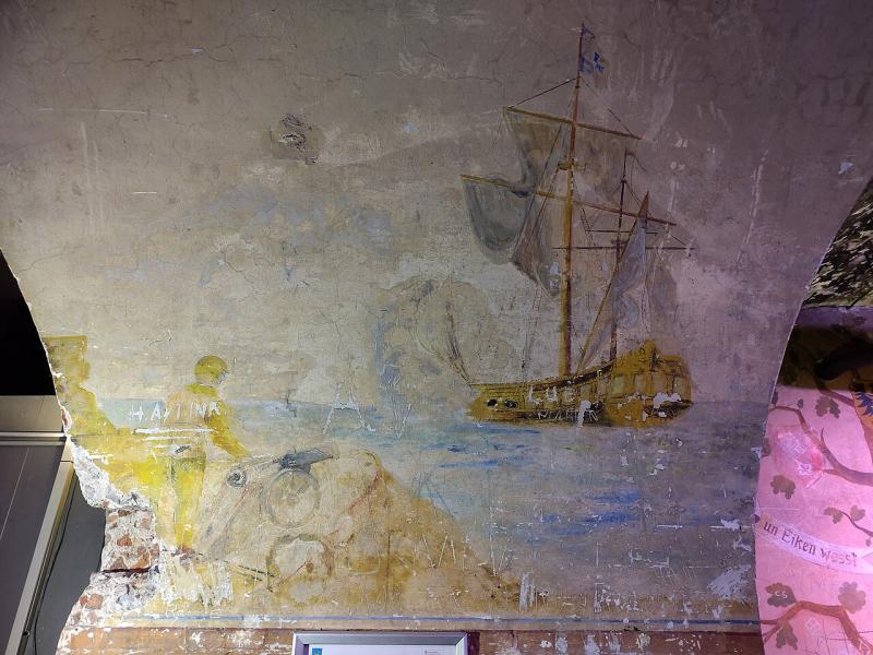 Op een drager in de koepelgalerij is een zee geschilderd met een historisch zeilschip, een galjoen. Aan de linkerkant onder is in een duinlandschap een soldaat geschilderd die een kanon bedient. De kleding en de helm van de soldaat is niet goed herleidbaar, om zijn middel hangt een sabel.