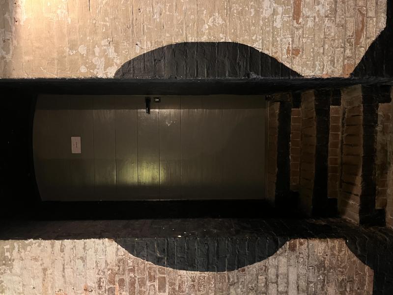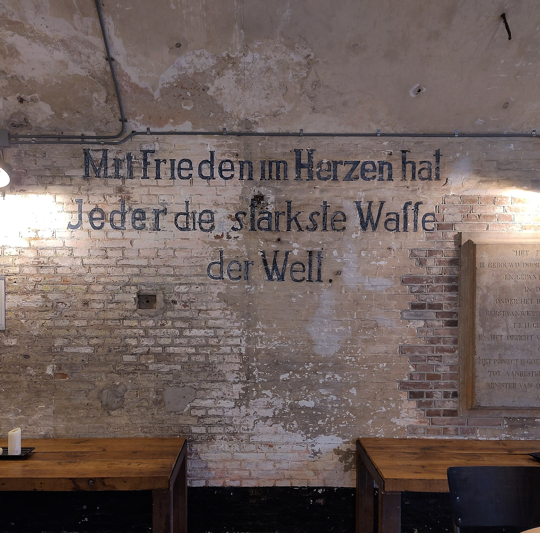 Op de witte muur van de hoofdingang van het fort is met zwarte letters de tekst geschilderd: Mit Frieden im Herzen hat Jeder die stärksten Waffe der Welt. De onderrand van de ruimte is zwart geschilderd, de nissen met een hoek voor de handen naar de zijruimtes, waaronder de keuken, zijn ook zwart.