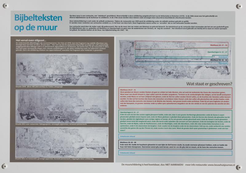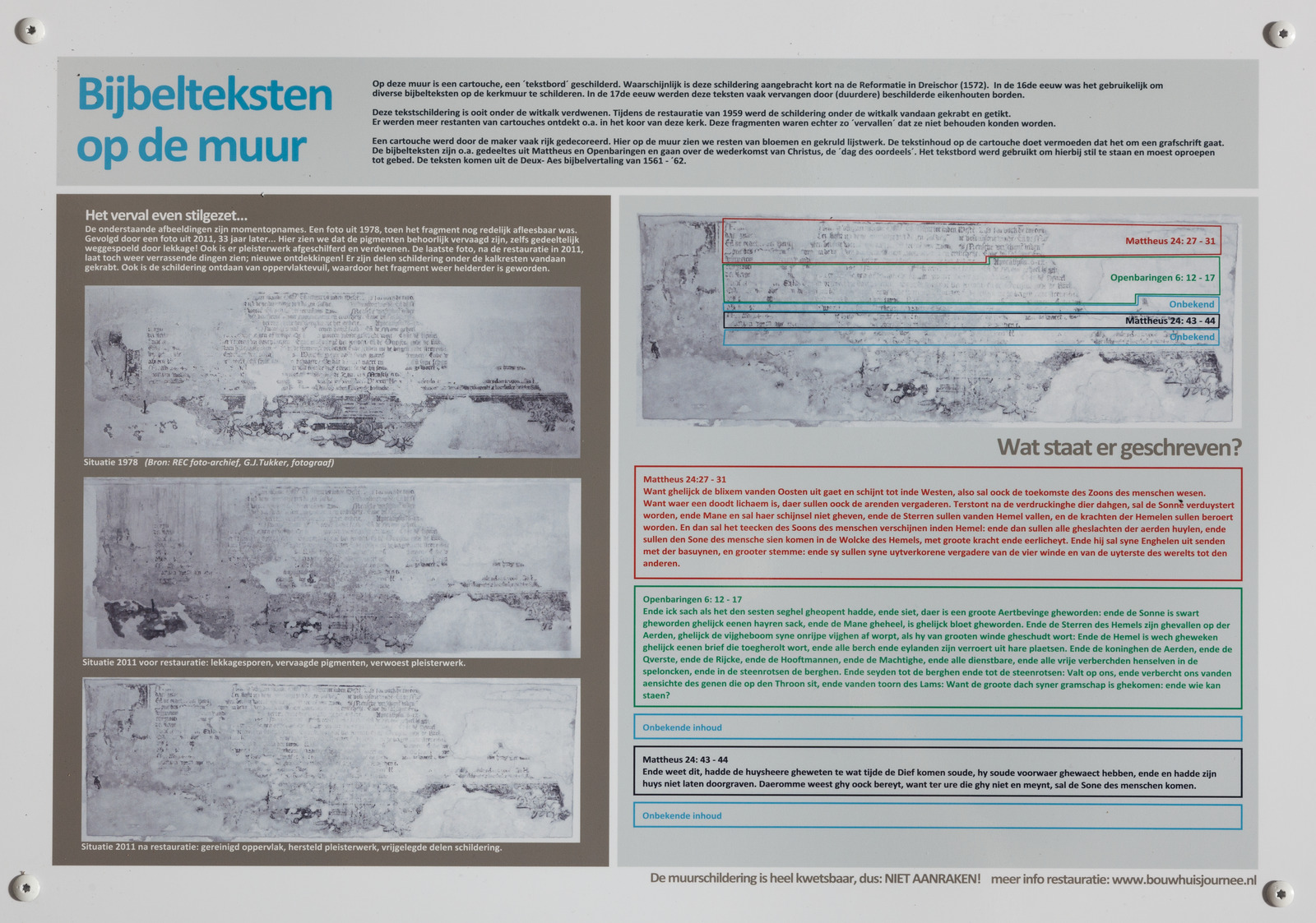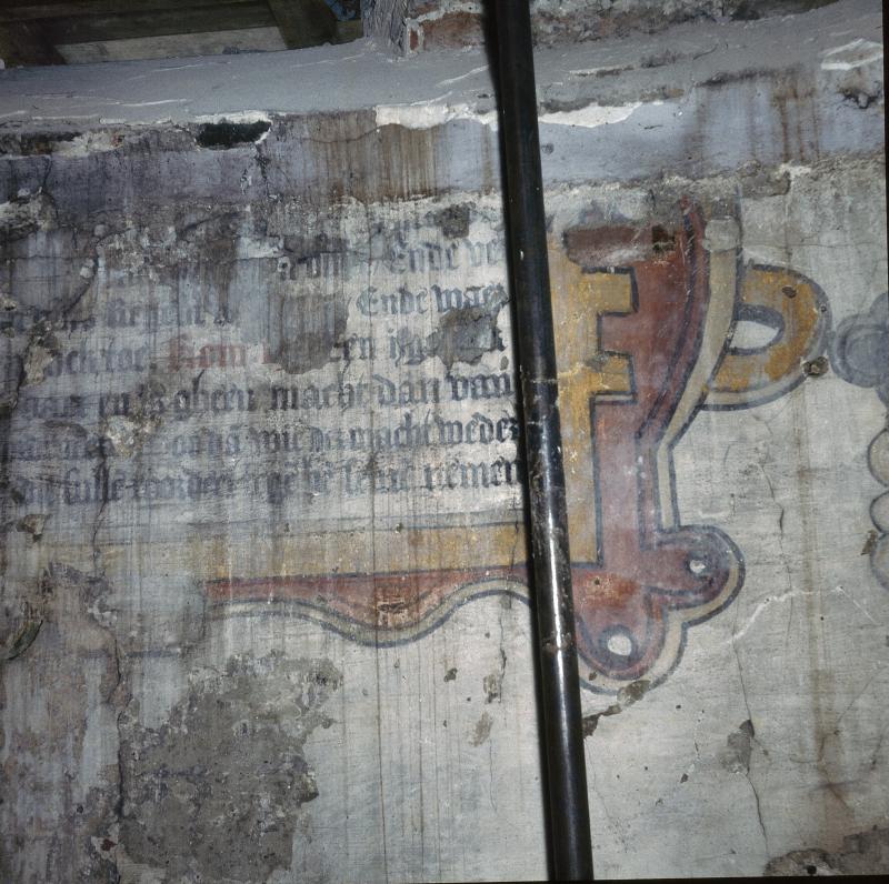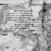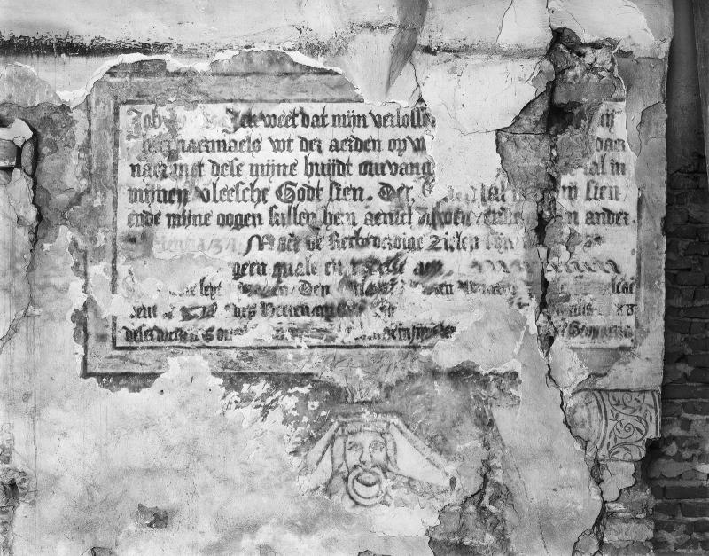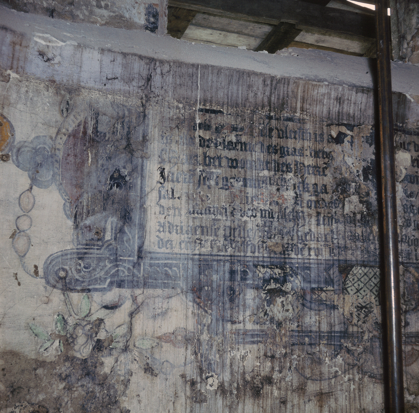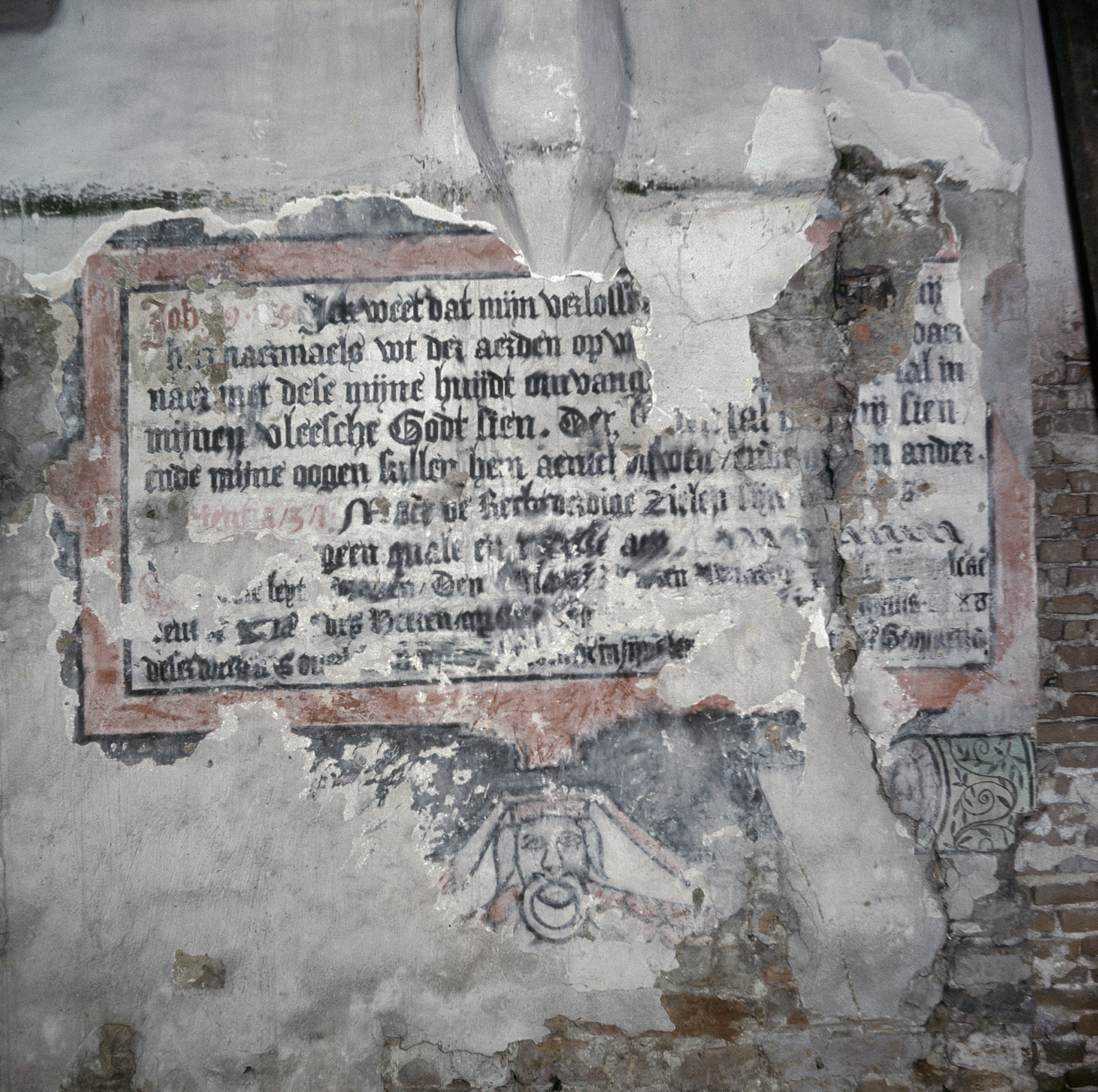 - Cartouches met diverse bijbelteksten. In de zestiende eeuw was het gebruikelijk om teksten op de muur te schilderen.
