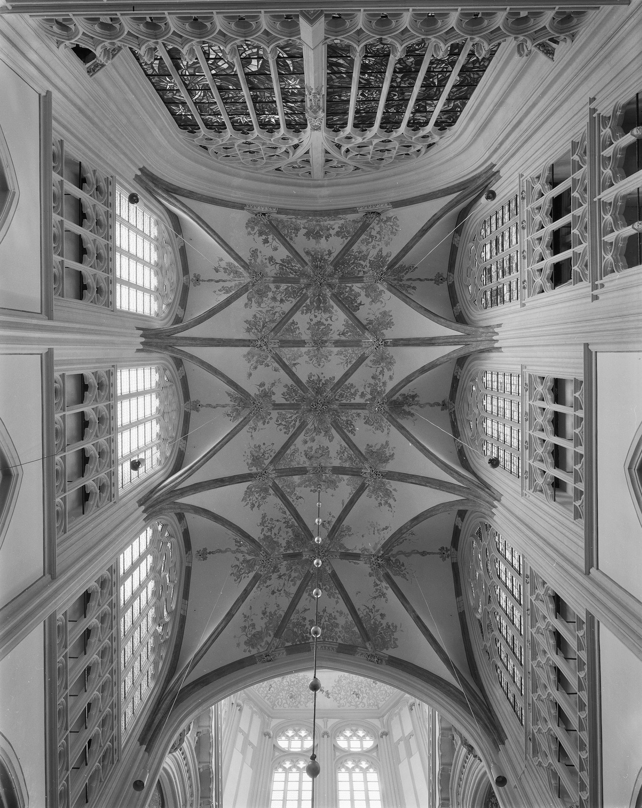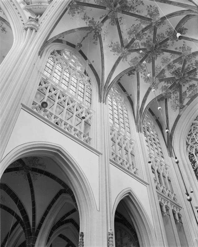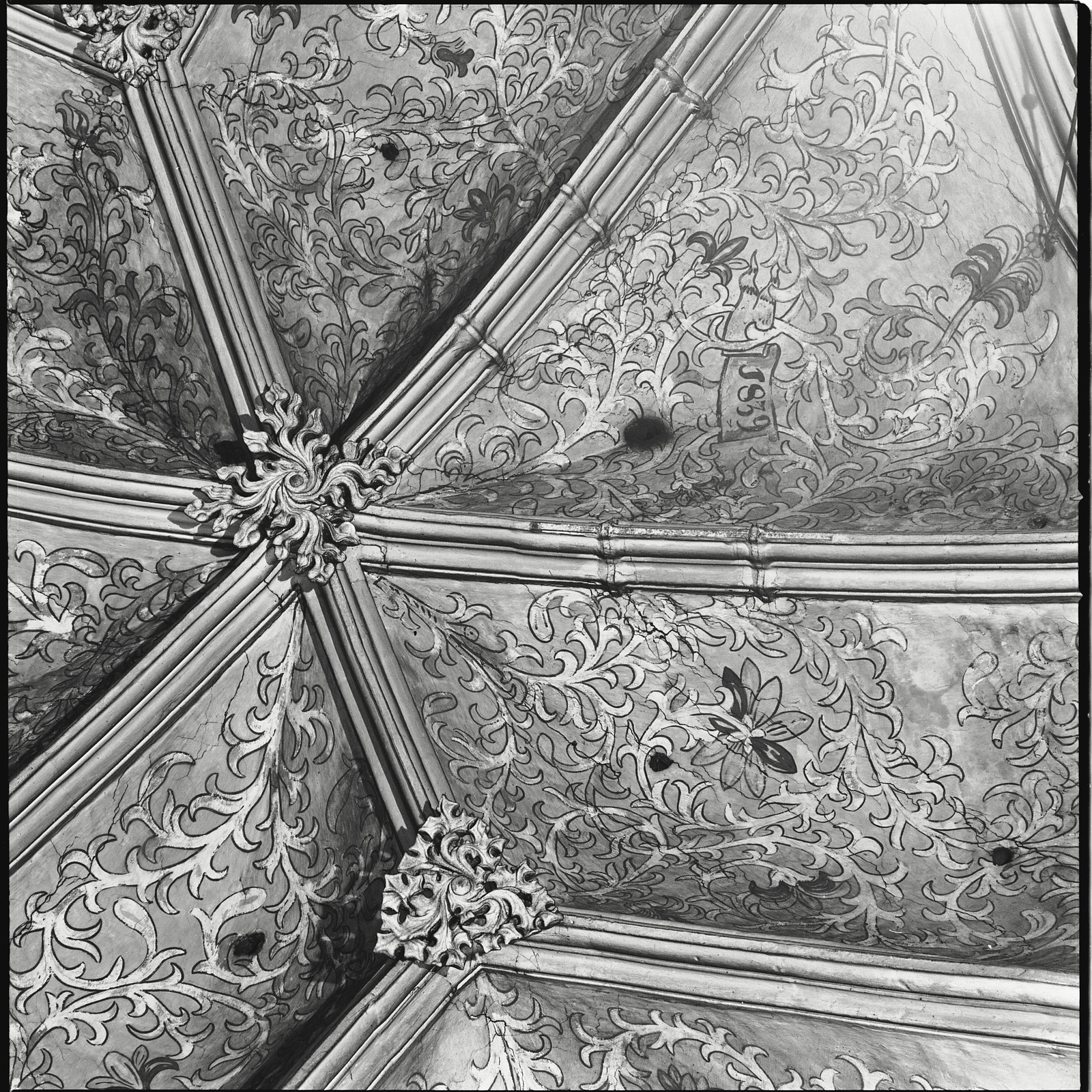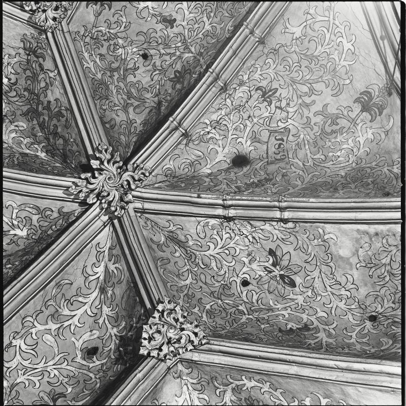 dat hier een deel van de originele schilderingen verloren is gegaan. Op het nieuwe metselwerk zijn kopieën geschilderd. Ook van de buitenste travee zijn kruisstukken (knooppunten) van gewelfribben vernieuwd. Het vrijgekomen schilderwerk dateert vermoedelijk van onmiddellijk na de bouwtijd van de overwelving, aan het einde van de 15de eeuw of in het begin van de 16de eeuw. De schildering lijkt weinig van de torenbrand van 1584 te lijden te hebben gehad. De decoratie is in zwarte lijnen en arceringen als schaduwwerking opgezet