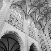 vooral lineair is gebleven achter het netwerk van de ribben in Engels rood met vergulde knopen op de kruisstukken. (Peeters, 1985, p. 123)