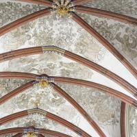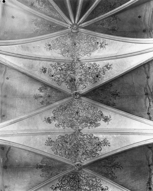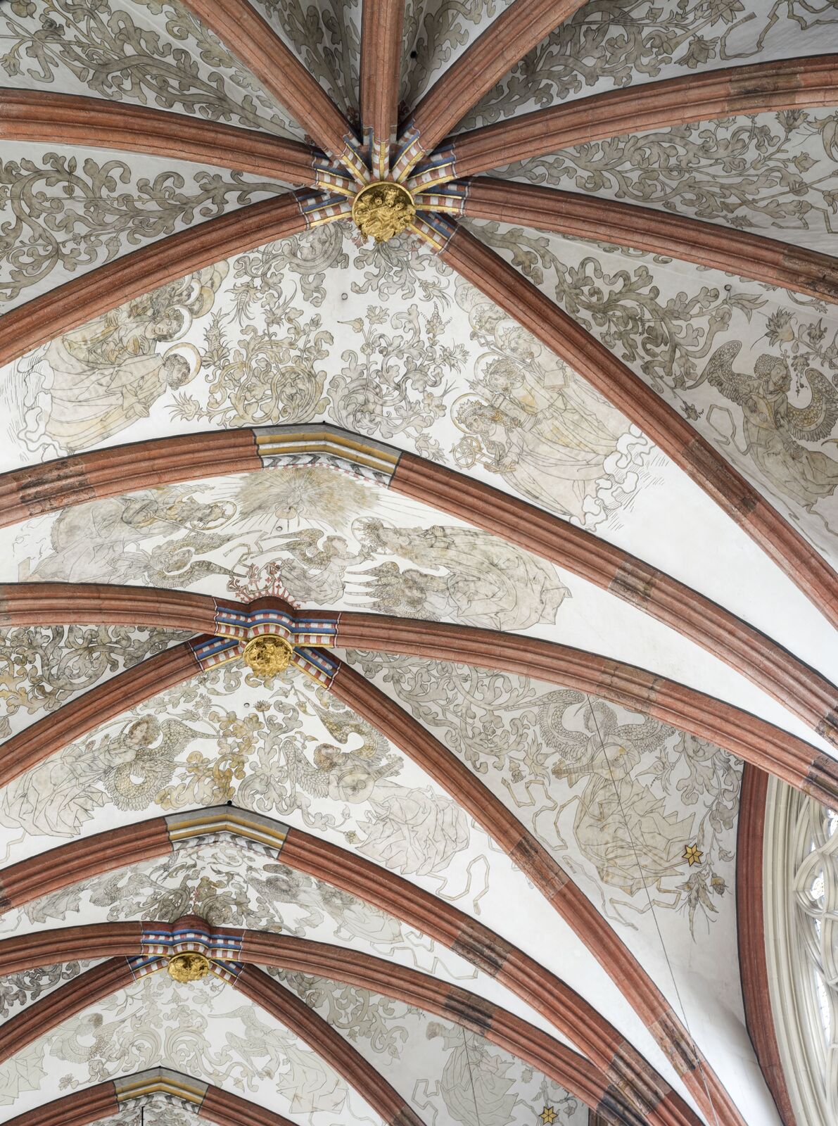 In 1982 - 1983 zijn de gewelfschilderingen in het koor teruggebracht naar de situatie van de 15de eeuw, begin 16de eeuw. De kleuren zijn verdwenen. Bladranken, stengels met bloemknoppen omgeven engelen met lange gewaden die met wierookvaten zwaaien of muziek maken op bazuinen, harpen en luiten en er zijn veel heiligen geschilderd en Maria en de duif van de heilige Geest. De schilderingen hangen samen met de voorstellingen van de sluitstenen.