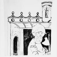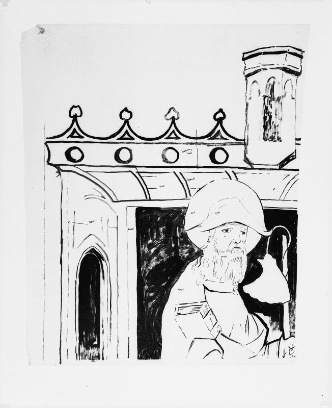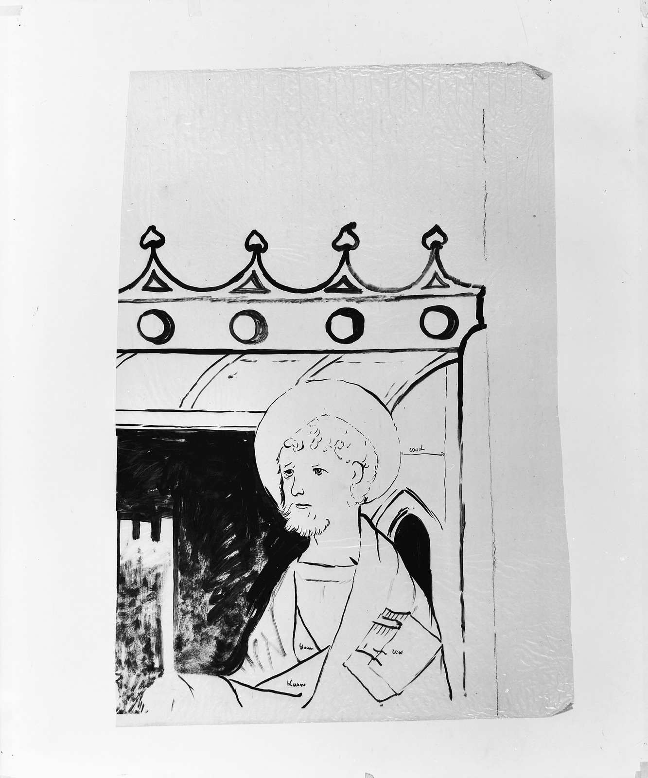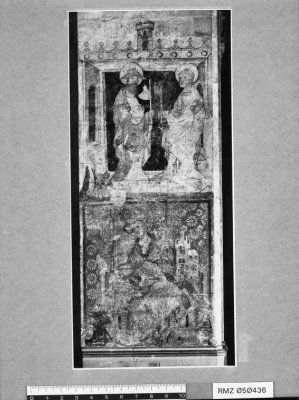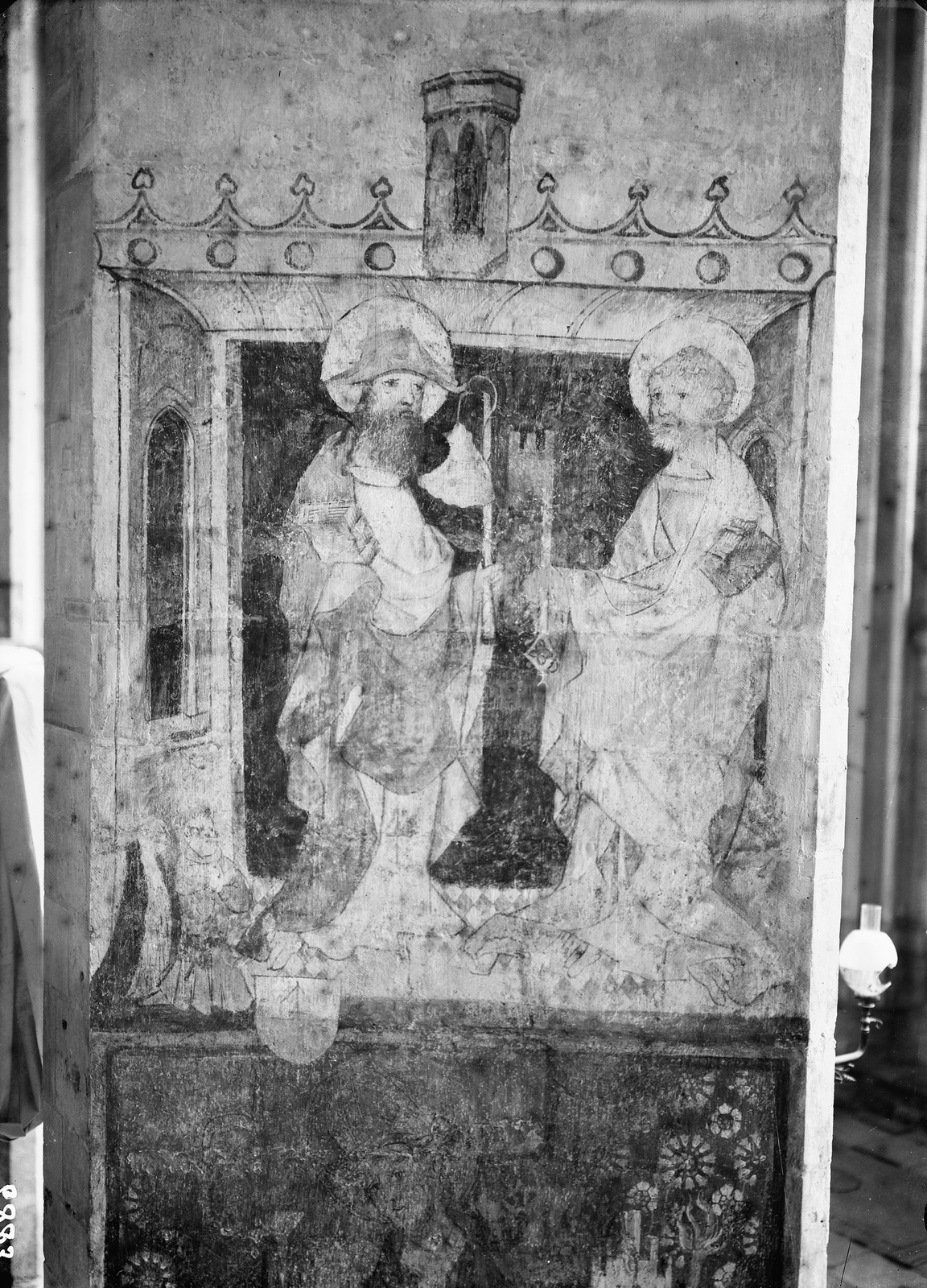 Op dezelfde pijler als de zittende bisschop, daarboven, zijn twee heiligen geschilderd, Jacobus met een pelgrimshoed en een boek en Petrus met een sleutel en een boek. Ze staan op een vloer van rode en witte tegels. In 1922 door Jacob Por gerestaureerd.