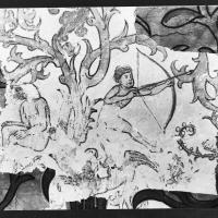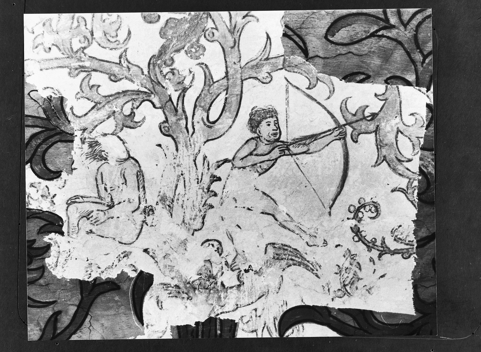 In het loof bevinden zich naakte mensfiguurtjes, mannen en een vrouw met verward haar, een met pijl en boog gewapend, een met een kromzwaard, vergezeld door een jachthond (met halsband) jagend op een hert en dartele hazen; ook is er een vogelnest met eieren. Bij het blootleggen van de naaktfiguurtjes bleek, dat zij ooit een censuur ondergaan hadden door wegkrassing van delen binnen de contouren. (Peeters, 1985, p. 318 en 319)