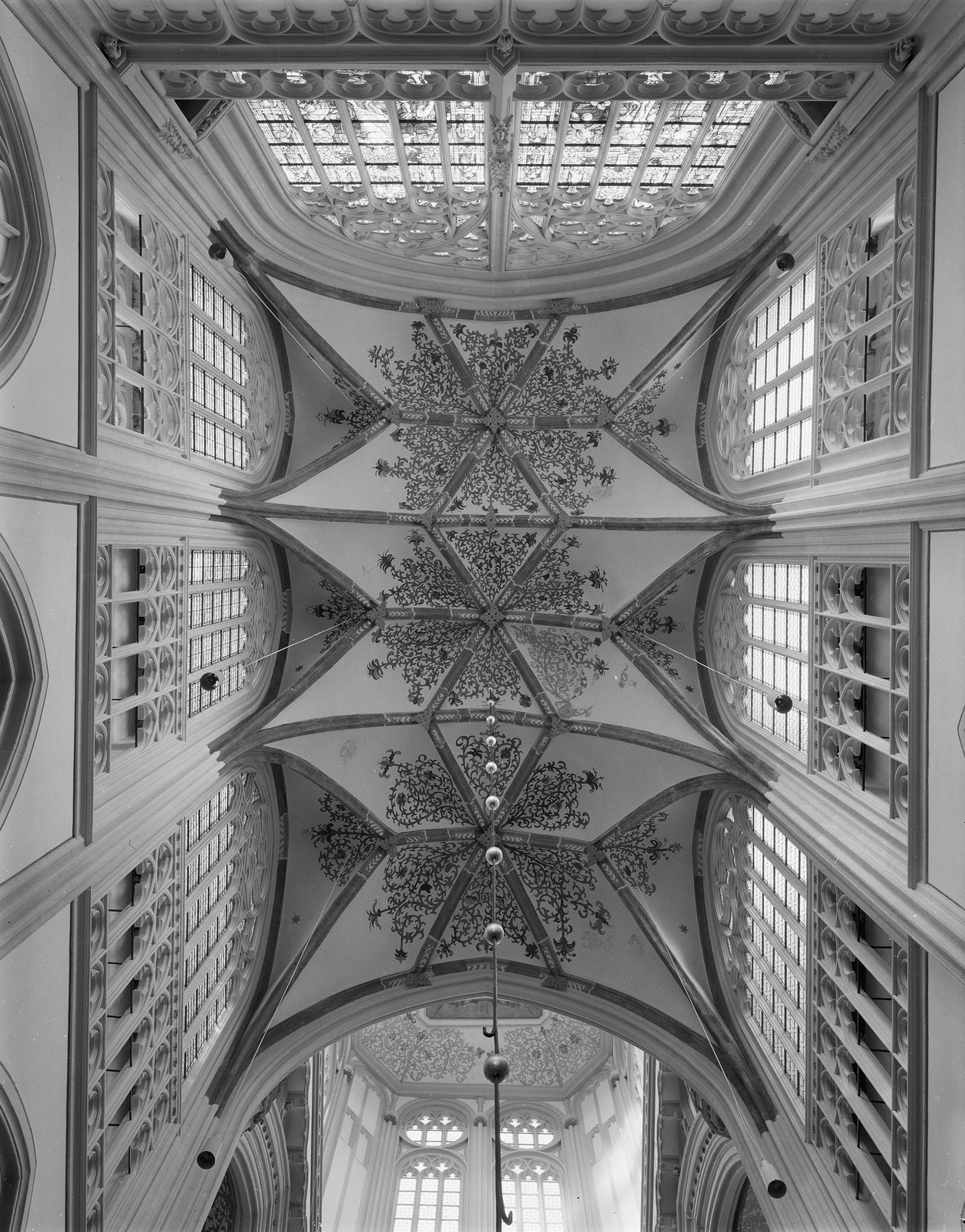 overeenkomstig de uitmonstering kort na de bouwtijd van de gewelven, vermoedelijk omstreeks 1520, en de distelvegetatie op de velden overeenkomstig de 19de-eeuwse decoratie, die toen echter samenging met een hernieuwde okergele ribbenbeschildering. Dat er van de oorspronkelijke versiering op de velden zo weinig over was, moet samenhangen met de schade, die deze gewelven bij de torenbrand van 1584 opgelopen hebben” (Peeters, 1985, p. 315)