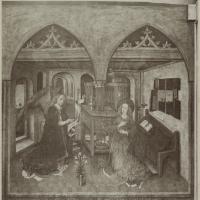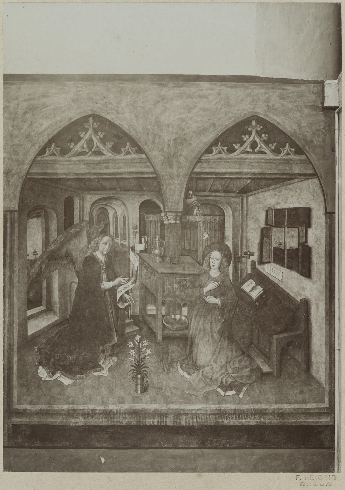"Vanaf de voltooiing van het noordtransept omstreeks 1450 fungeerde deze ruimte als Mariakapel en mogelijk was er toen al sprake van een Onze-Lieve Vrouwebroederschap (in ieder geval vanaf 1475). De grote muurschildering met de Annunciatie heeft hier een duidelijke ‘devotionele functie’ “ (Wezel, et.a., 2003, p. 84)