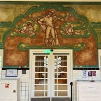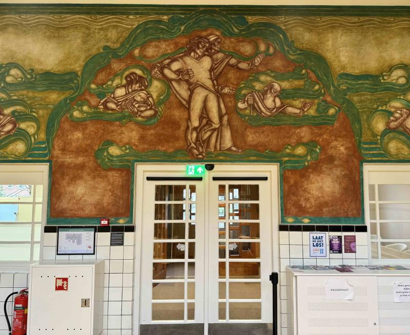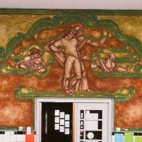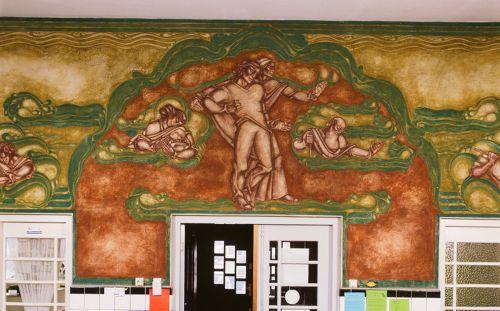 Muurschildering boven de deuren van de hoofdingang. Afbeeldingen van de mens in verschillende levensfasen. Decoratieve groen-blauwe rand en omringende versieringen.